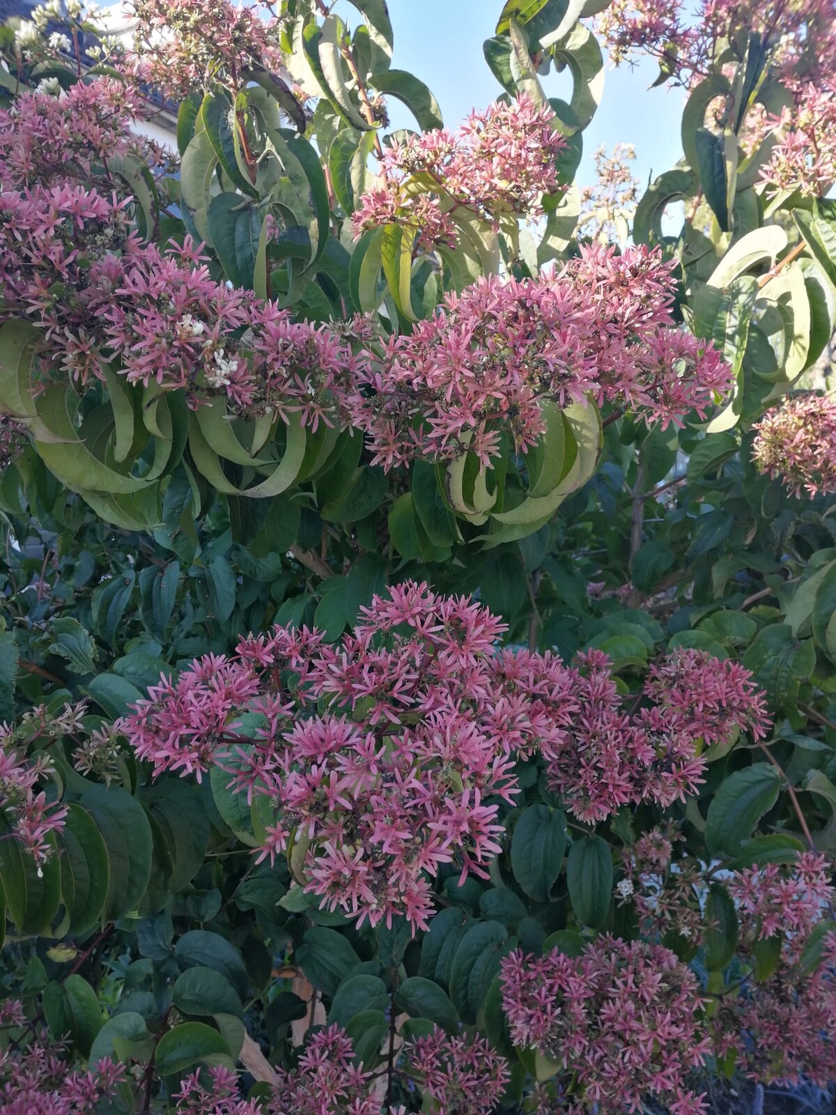 Das auffälligste Merkmal des Hochstamm Sieben-Söhne-des-Himmels ist seine Blüte. Die weißen, duftenden Blüten erscheinen in Rispen und bieten im Spätsommer und Herbst eine spektakuläre Show.