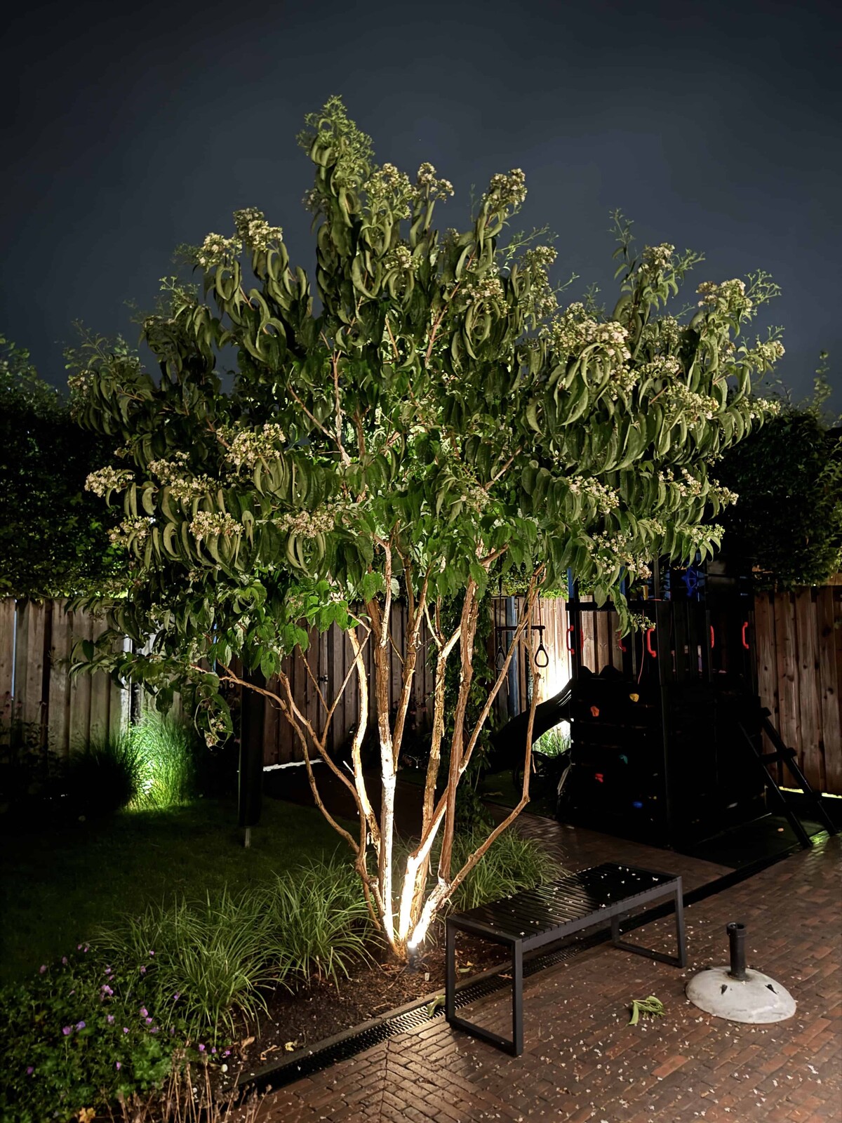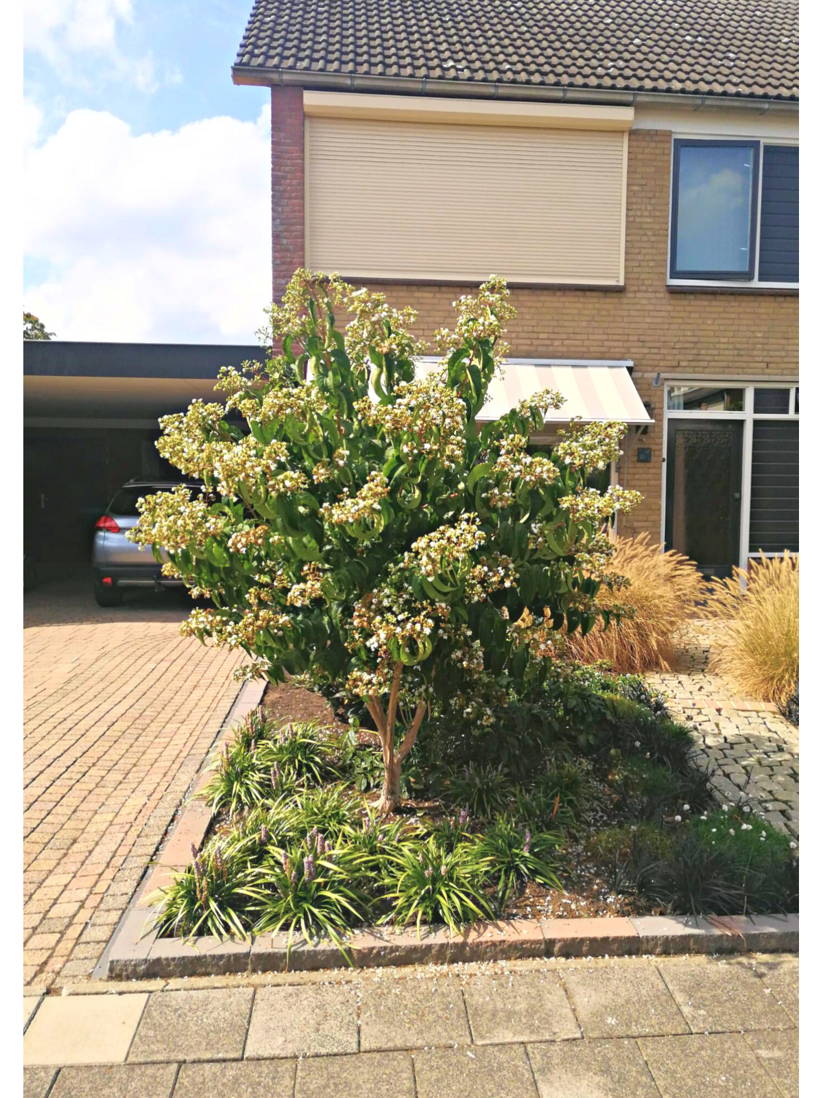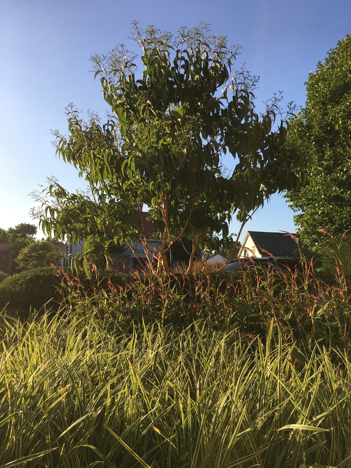 Ab Spätsommer (August) erscheinen dichte Rispen aus duftenden, weißen Blüten – wertvolle Nektarquelle in einer spätblühenden Saison.