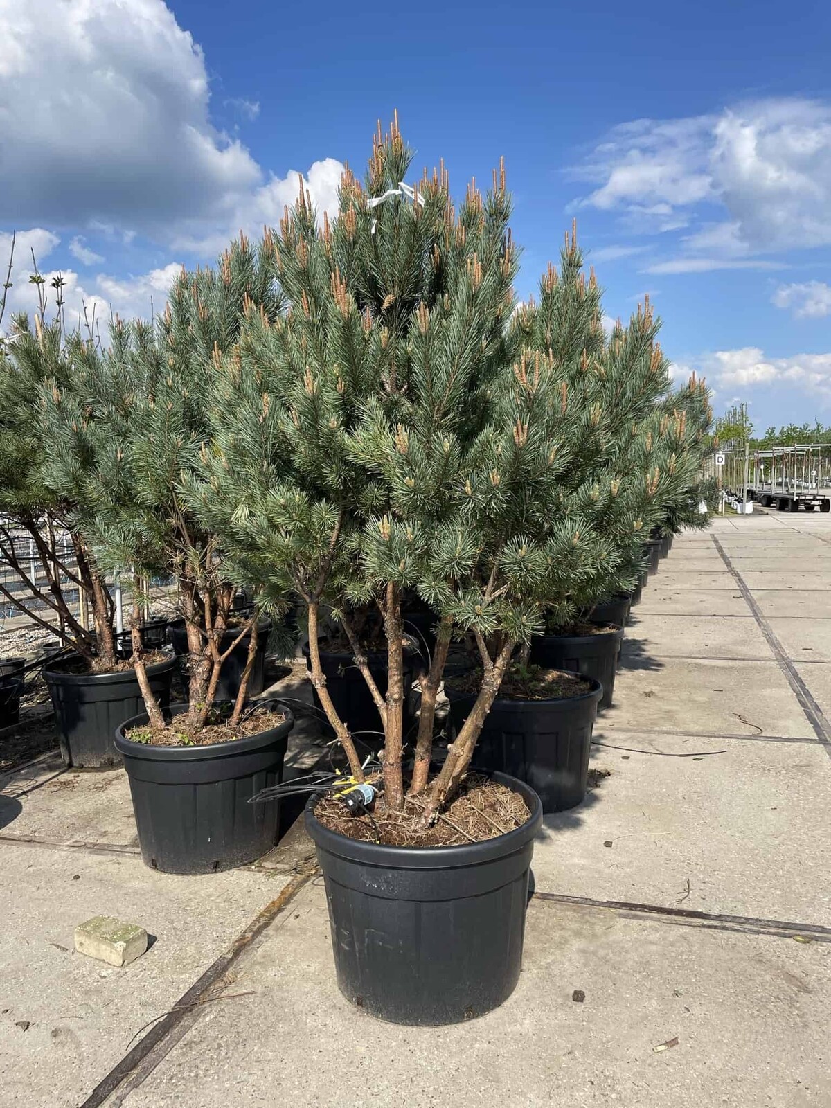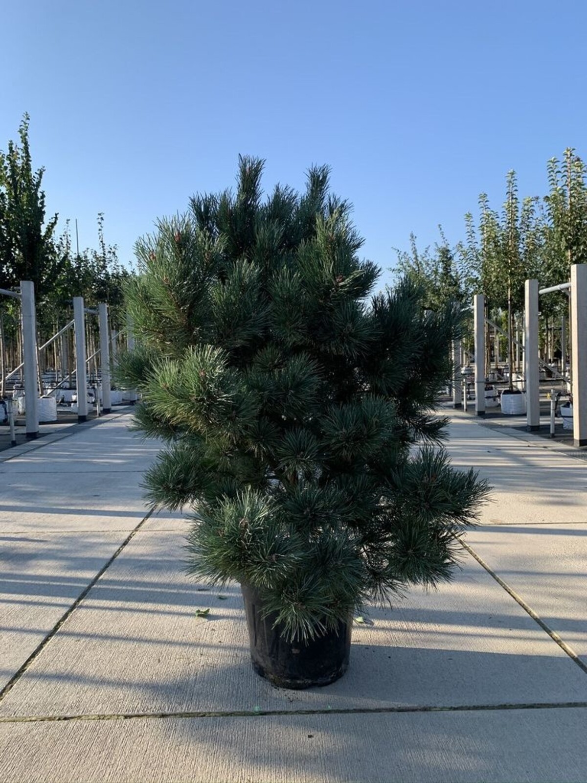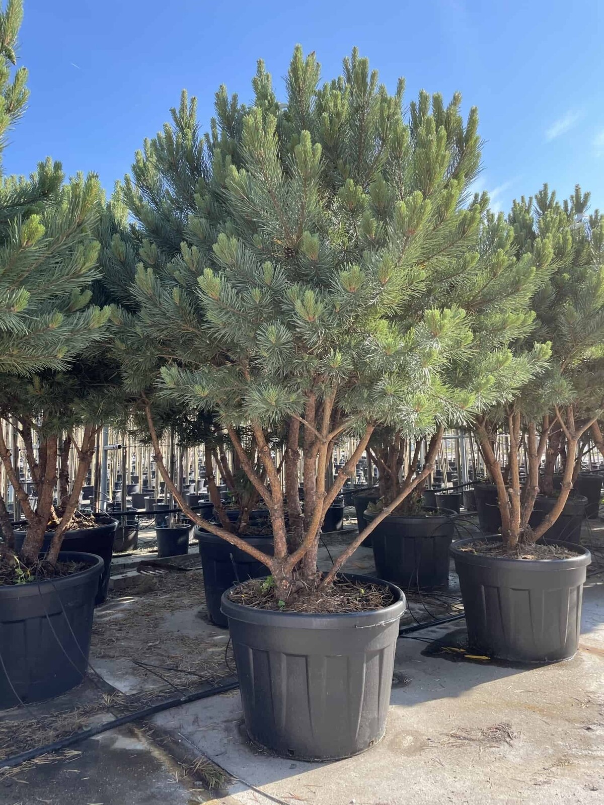 Der Mehrstämmige Silberkiefer 'Watereri' (Pinus sylvestris 'Watereri') ist eine kompakte, langsam wachsende Zierkiefer mit stahlblauen Nadeln und einer markanten Rinde. Durch die mehrstämmige Wuchsform entfaltet sie eine besonders elegante Struktur und eignet sich ideal als Solitär für moderne oder naturnahe Gartenkonzepte. Sie erreicht eine Höhe von etwa 3–6 m und eine Breite von ca. 3–6 m.