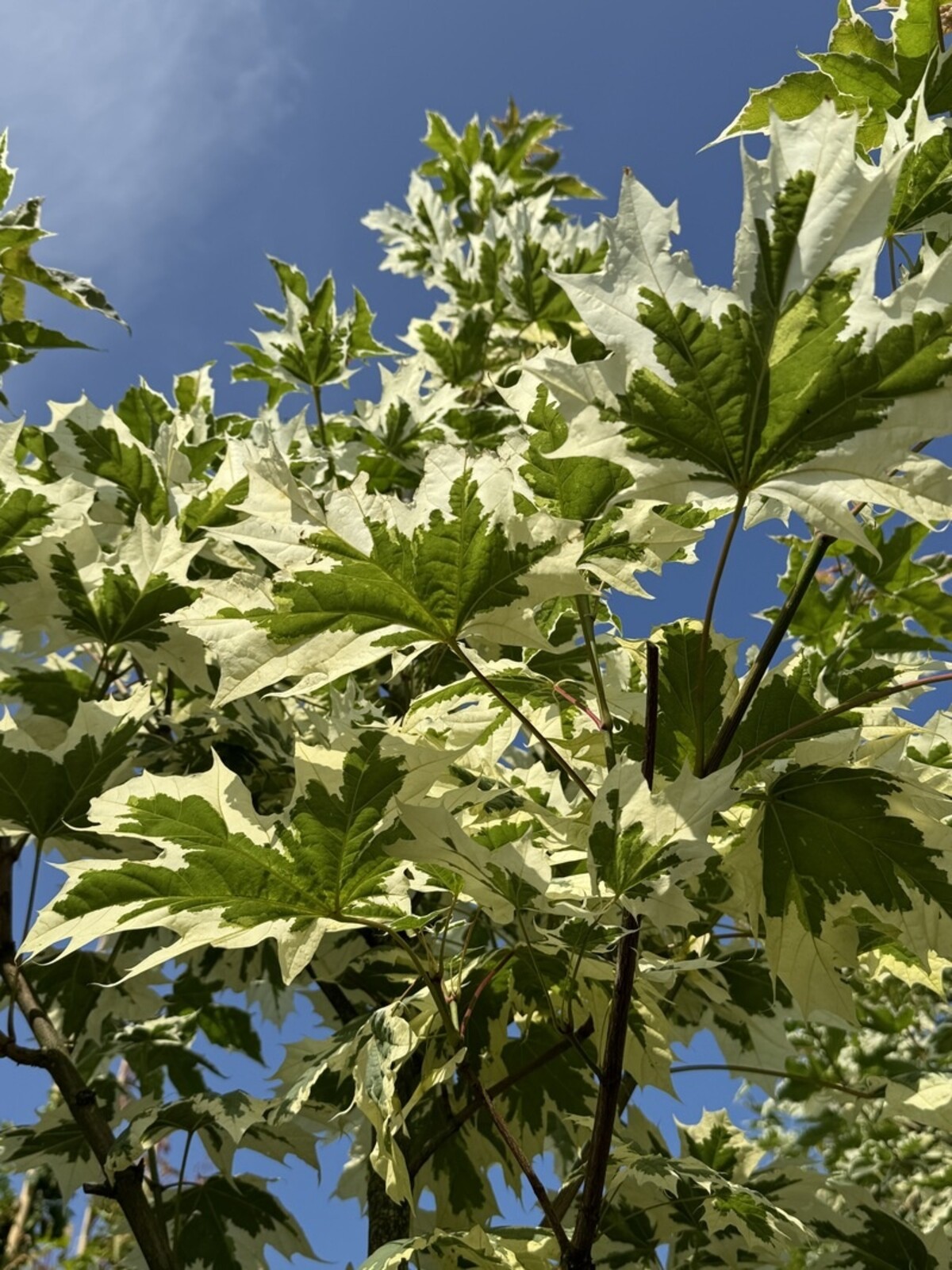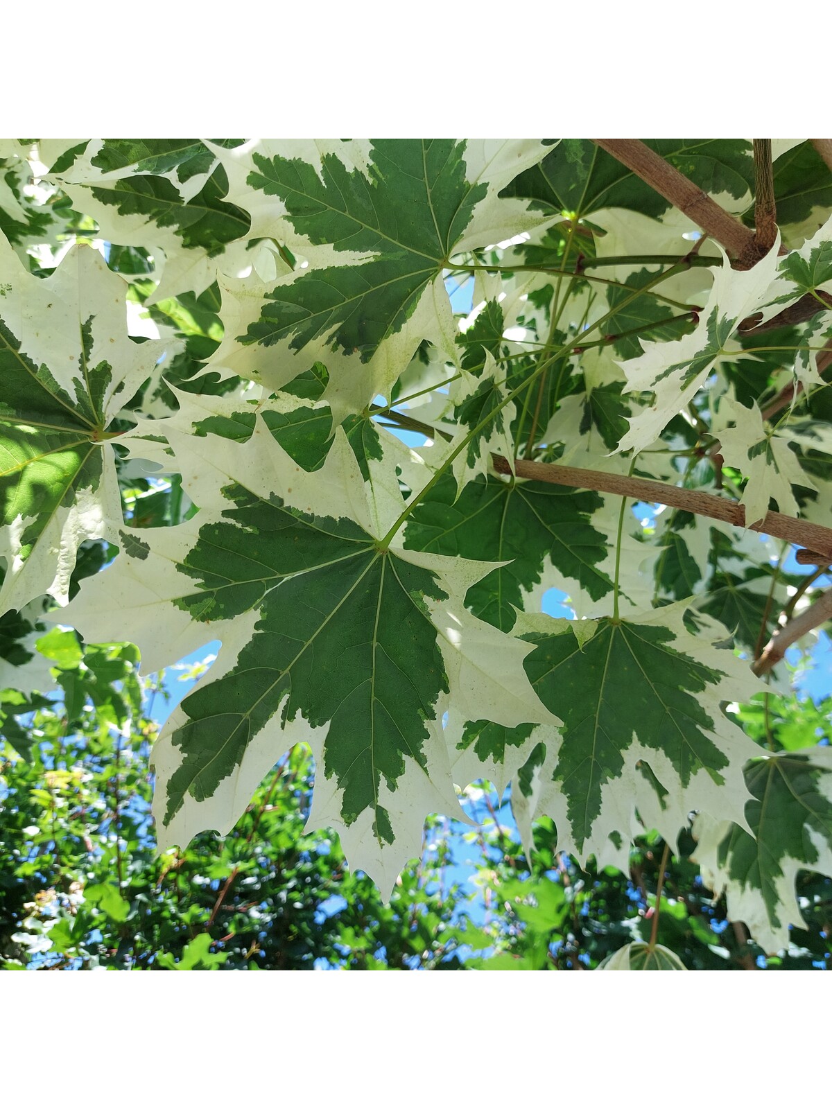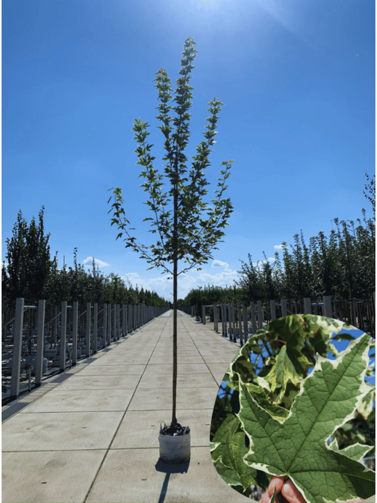 Der Spitzahorn 'Drummondii' ist bekannt für seine auffälligen, panaschierten Blätter mit einem cremeweißen Rand um das dunkelgrüne Zentrum. Im Herbst verfärben sich die Blätter in leuchtende gelbe und orangefarbene Töne. Dieser Baum erreicht eine Höhe von etwa 10 bis 13 Metern und passt gut in mittelgroße bis große Gärten.