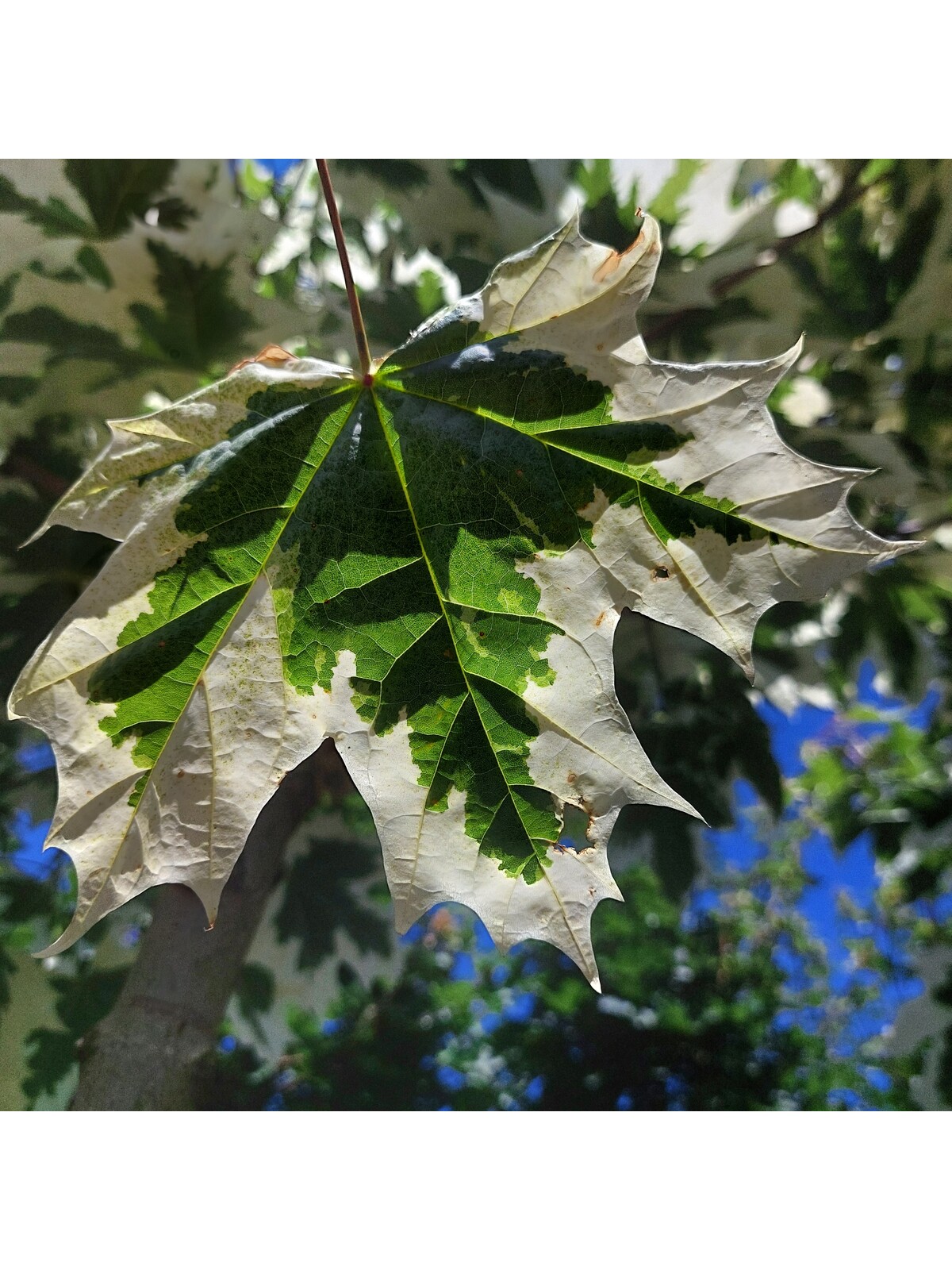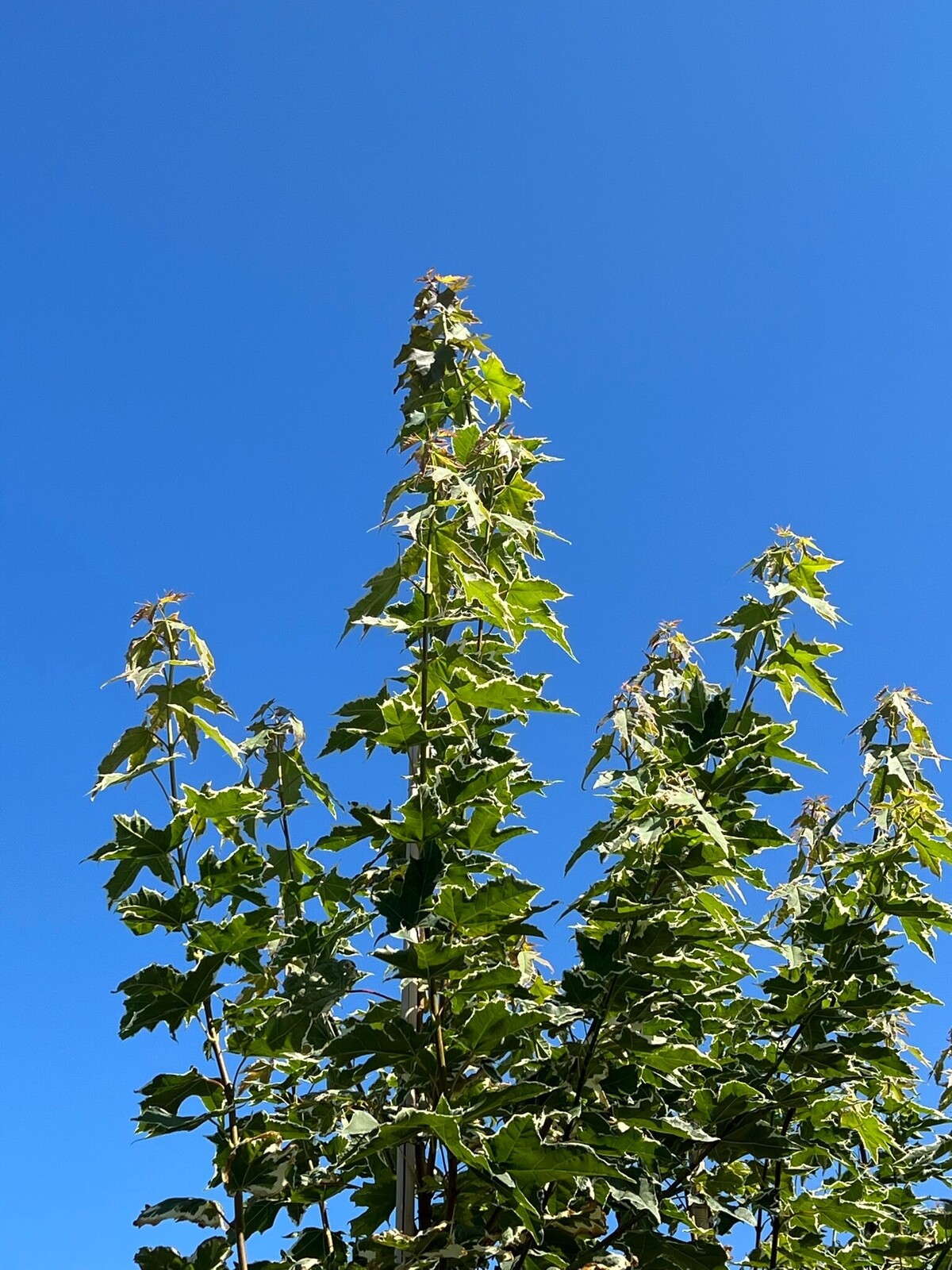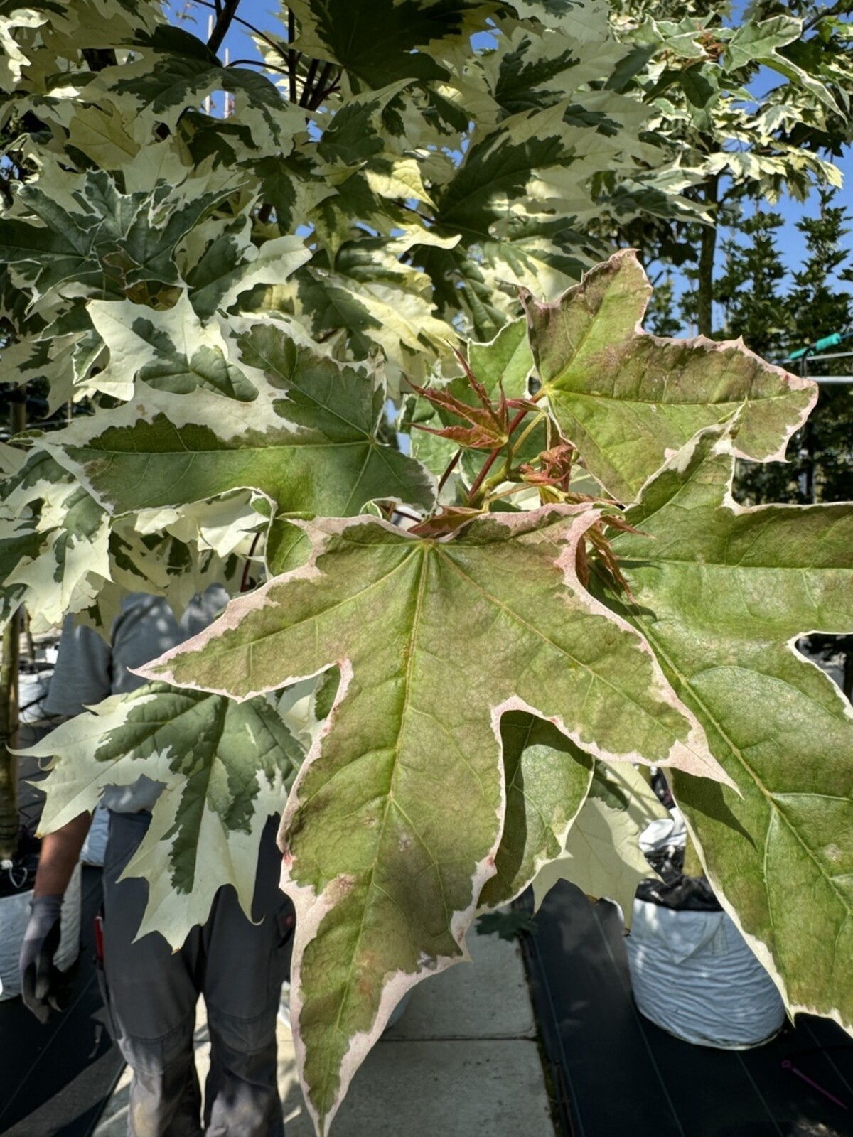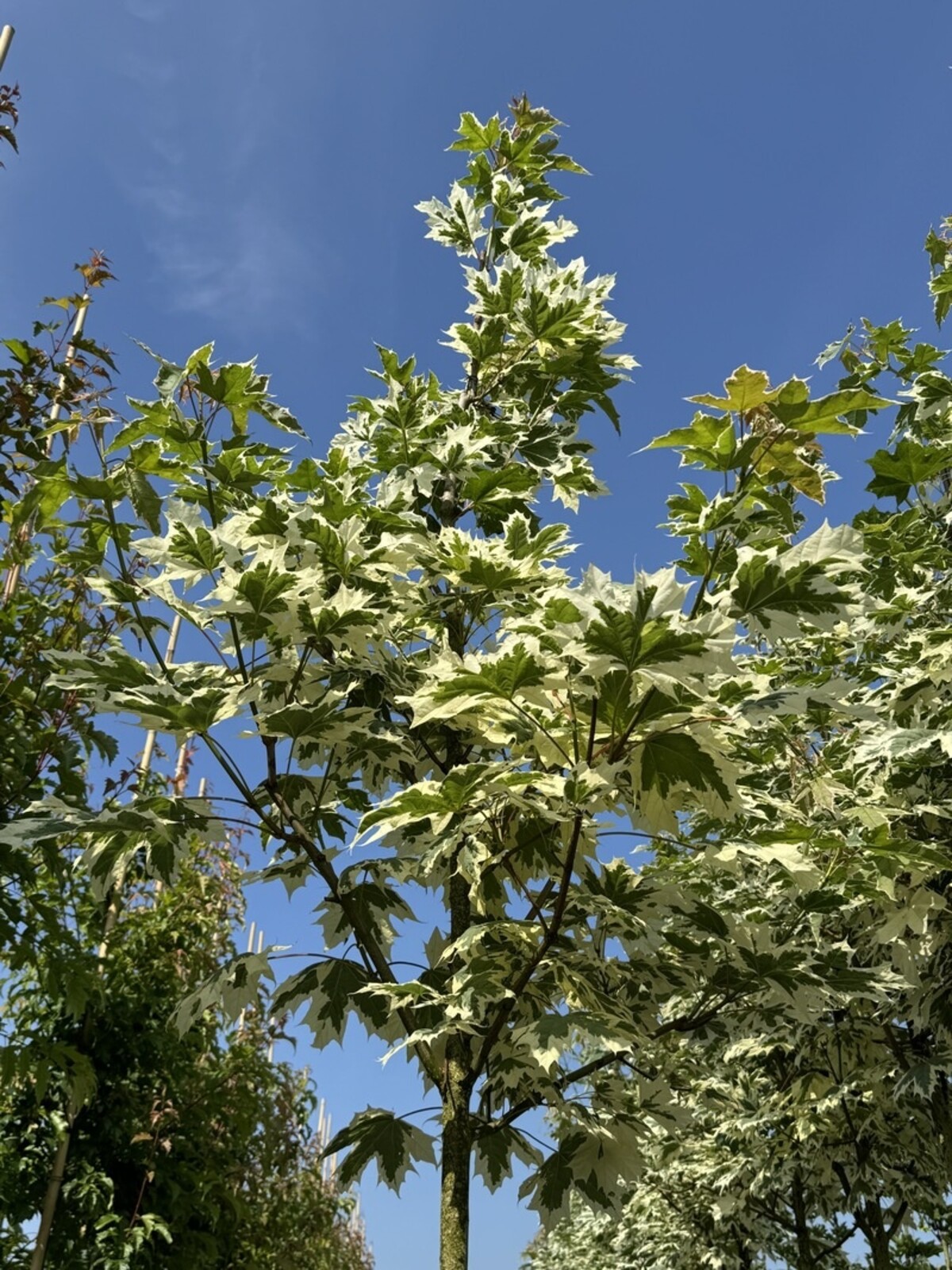 Der Spitzahorn 'Drummondii' ist bekannt für seine auffälligen, panaschierten Blätter mit einem cremeweißen Rand um das dunkelgrüne Zentrum. Im Herbst verfärben sich die Blätter in leuchtende gelbe und orangefarbene Töne. Dieser Baum erreicht eine Höhe von etwa 10 bis 13 Metern und passt gut in mittelgroße bis große Gärten.