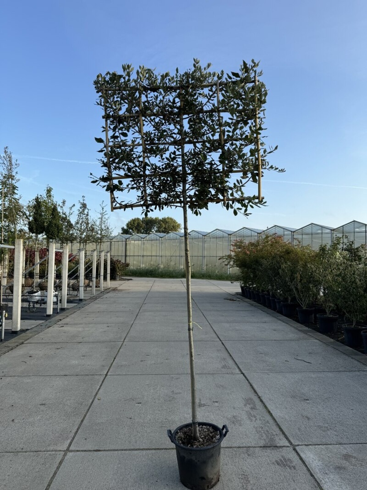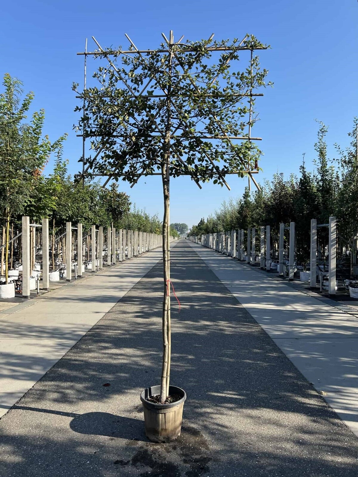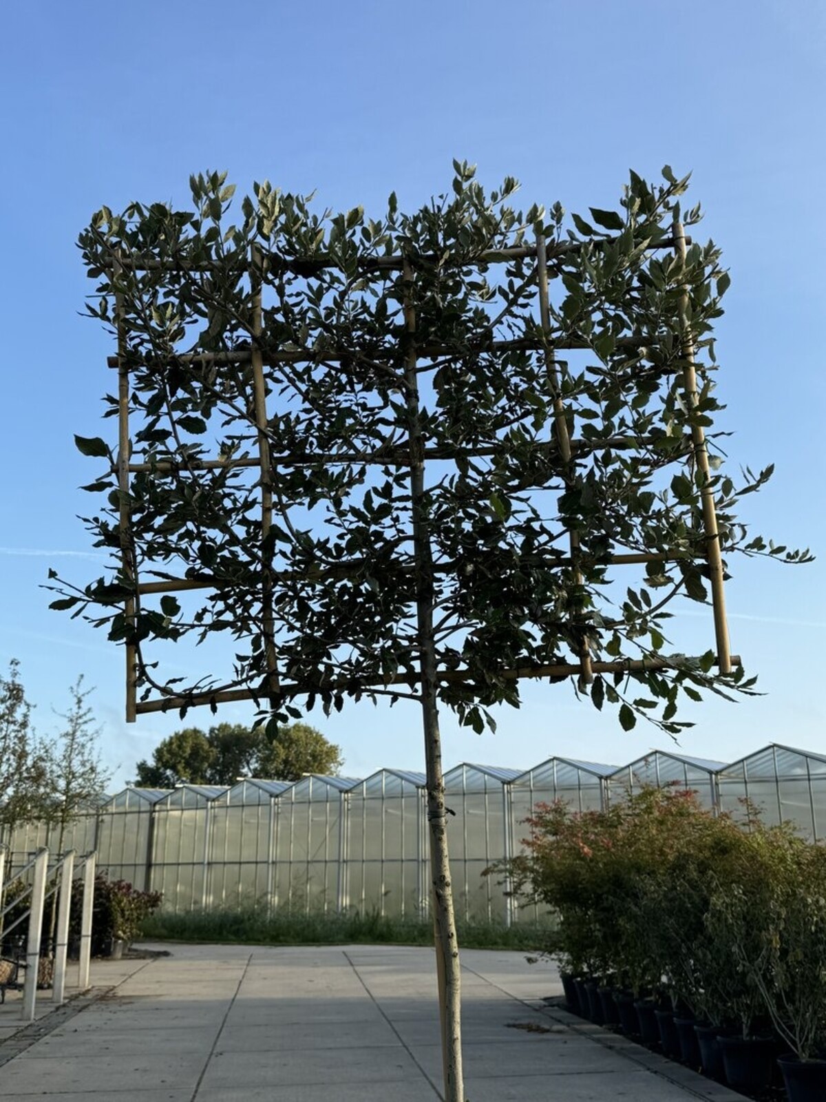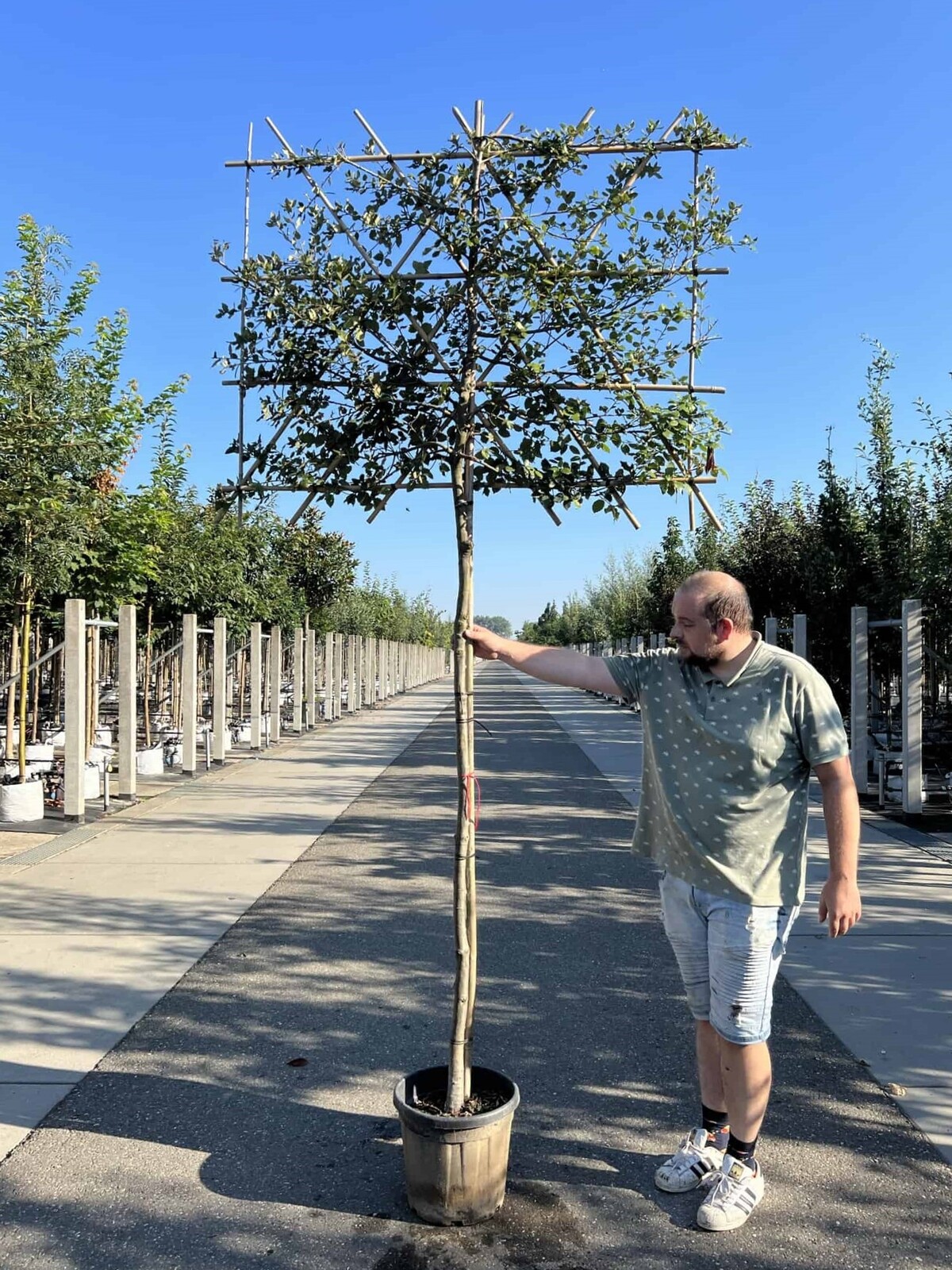 Die Stammhöhe eines Spalierbaums wird immer gemessen von der Stelle, an der der Baum aus dem Topf oder dem Wurzelballen wächst, bis zum ersten Ast der Krone.