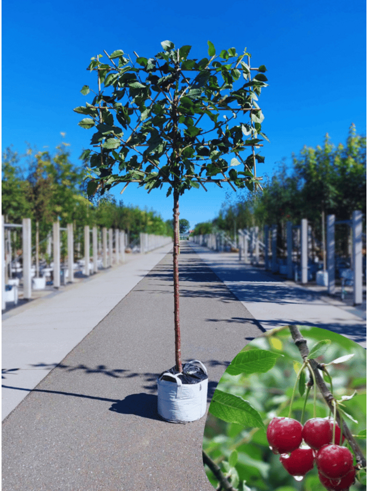Einer der größten Vorteile der Süßkirsche 'Kordia' als Spalierbaum ist, dass sie nur wenig Platz benötigt. Durch die flache Wuchsform können Sie diesen Baum leicht an eine Wand oder einen Zaun pflanzen, was ihn ideal für kleinere Gärten macht. Zudem sorgt das Spalier dafür, dass der Baum beim Ernten der Kirschen gut zugänglich ist.