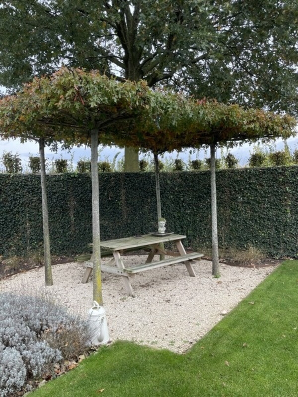 Die Dachform bildet eine flache, geschlossene Ebene mit viel Blattmasse, dadurch entsteht ein wirkungsvoller, natürlicher Sonnenschutz mit klarer Linienführung. -