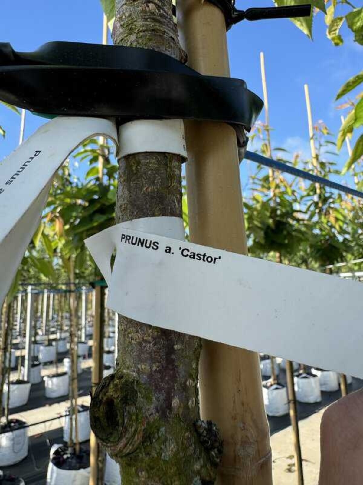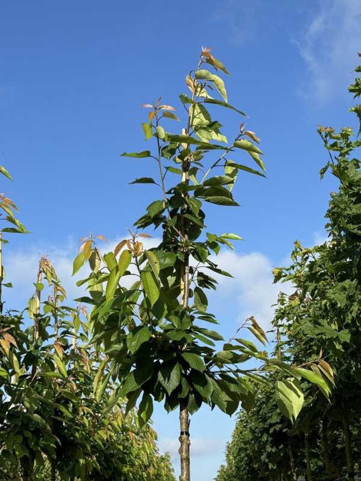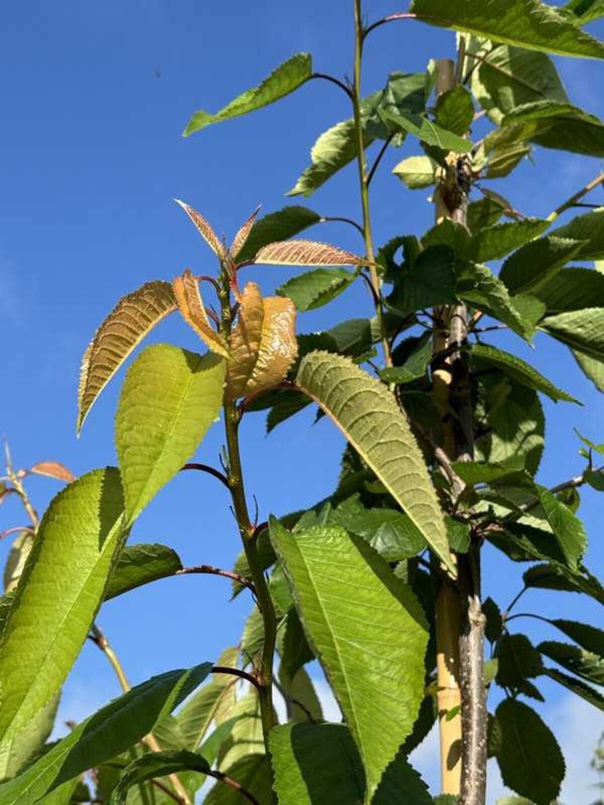 Die Pflege der Prunus avium 'Castor' ist unkompliziert. Schneiden Sie den Baum nach der Ernte im Sommer, um die Form zu erhalten und tote oder sich kreuzende Äste zu entfernen. Regelmäßiges Gießen während Trockenperioden ist besonders im ersten Jahr nach der Pflanzung wichtig.