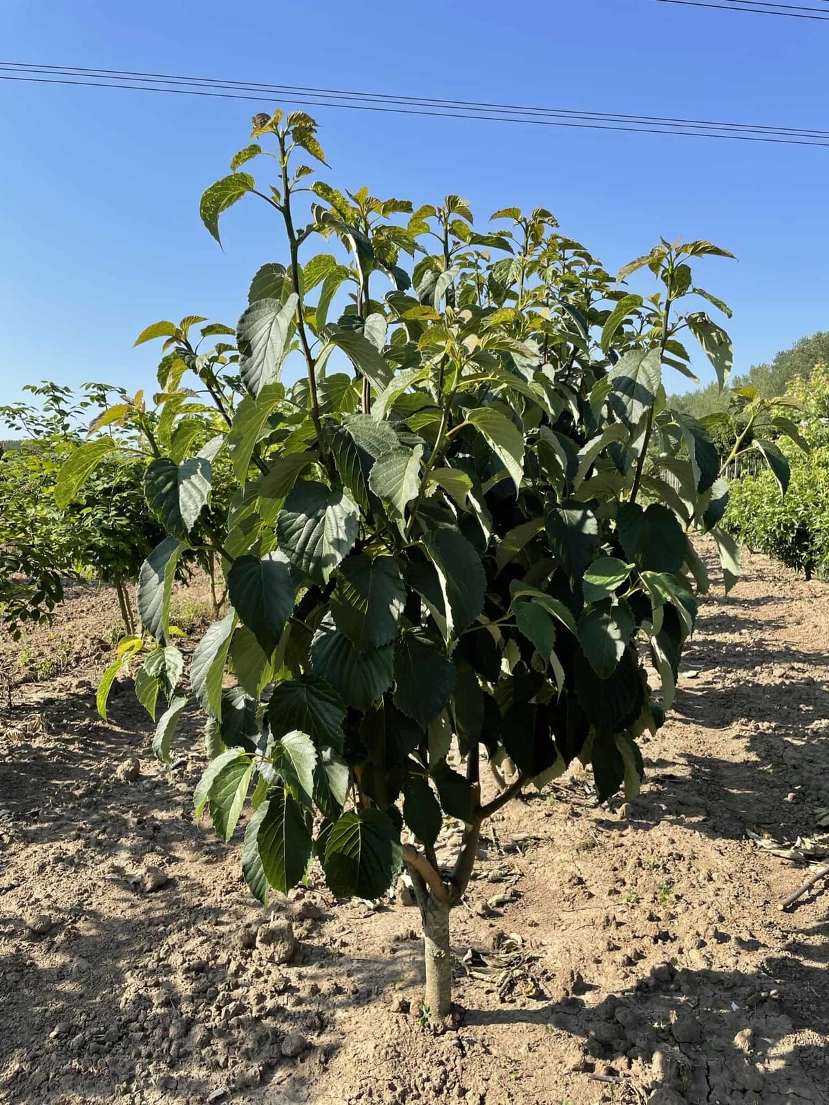 Dichtes, herzförmiges Laub spendet angenehmen, lichtdurchlässigen Schatten; Früchte beginnen sich zu entwickeln.