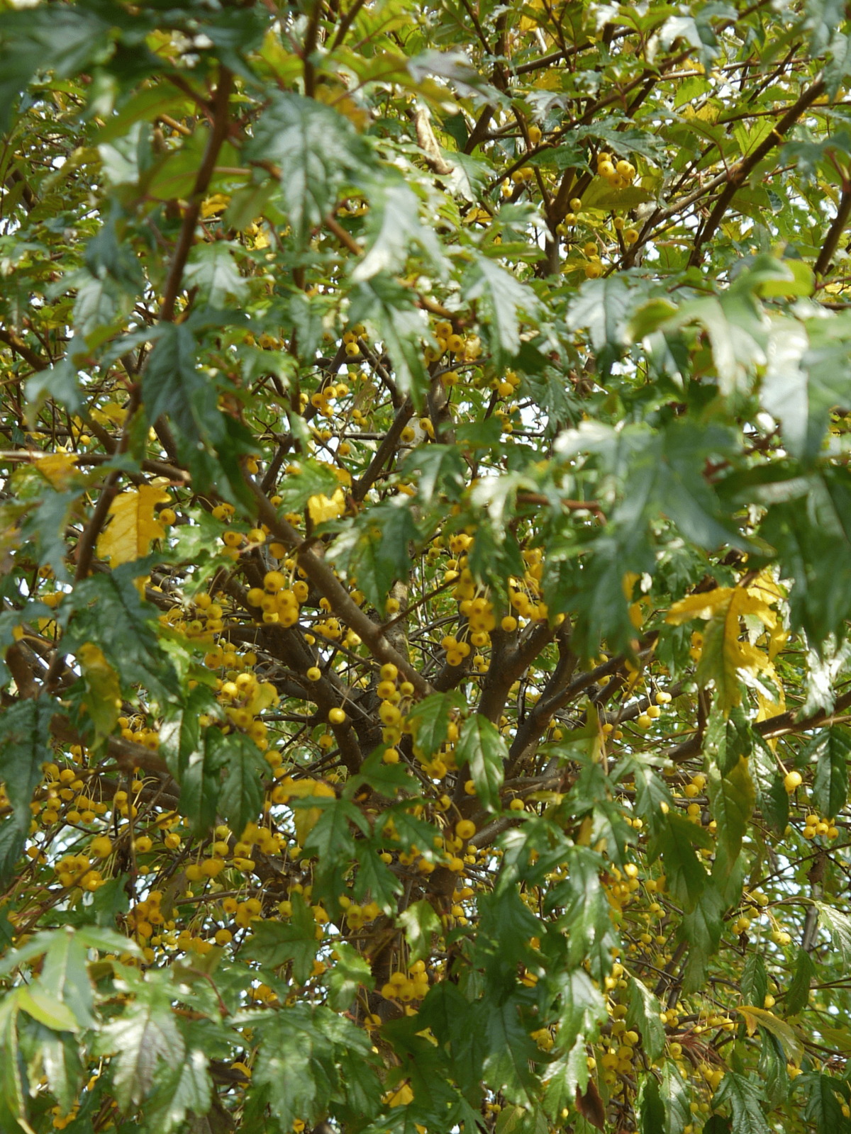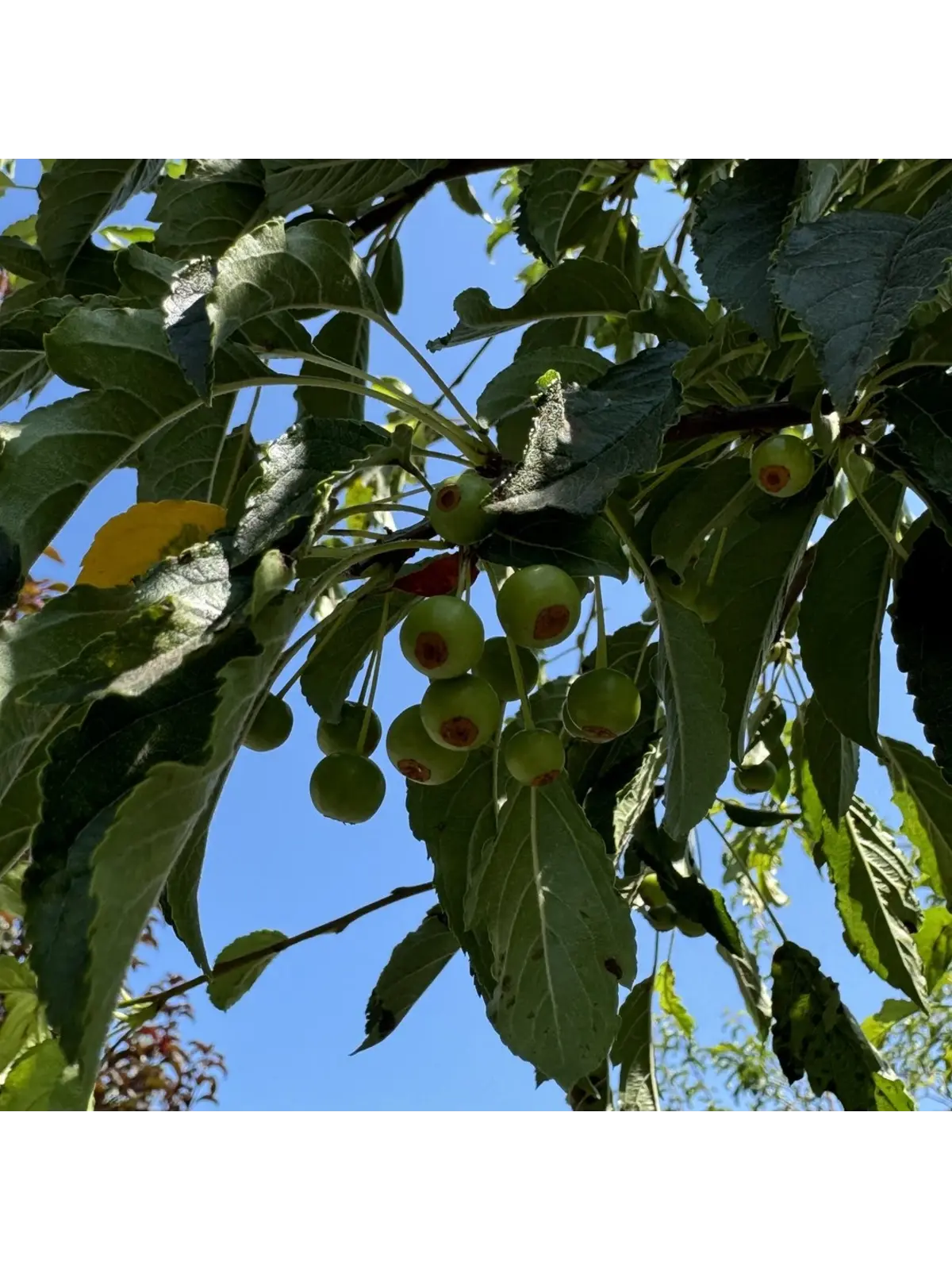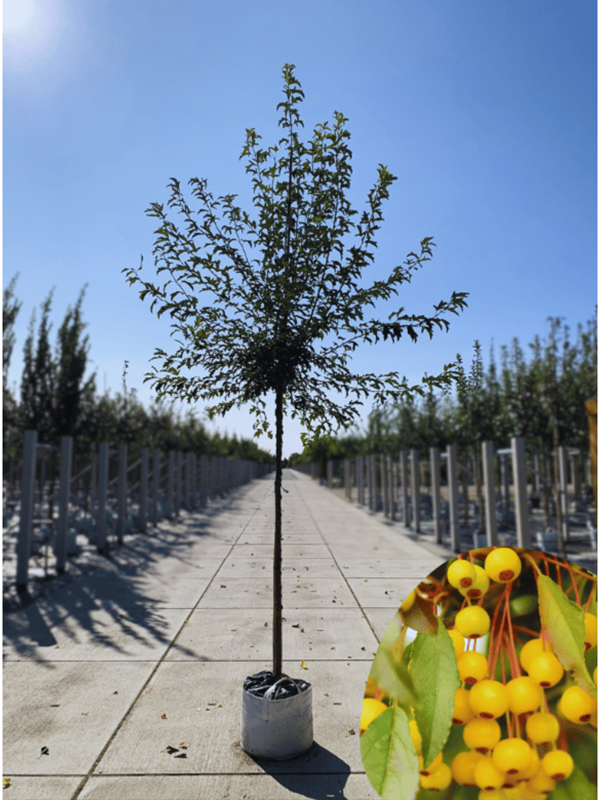 Im Herbst färbt sich der Baum goldgelb, und die kleinen gelben Zieräpfel bleiben bis Ende Oktober am Baum.