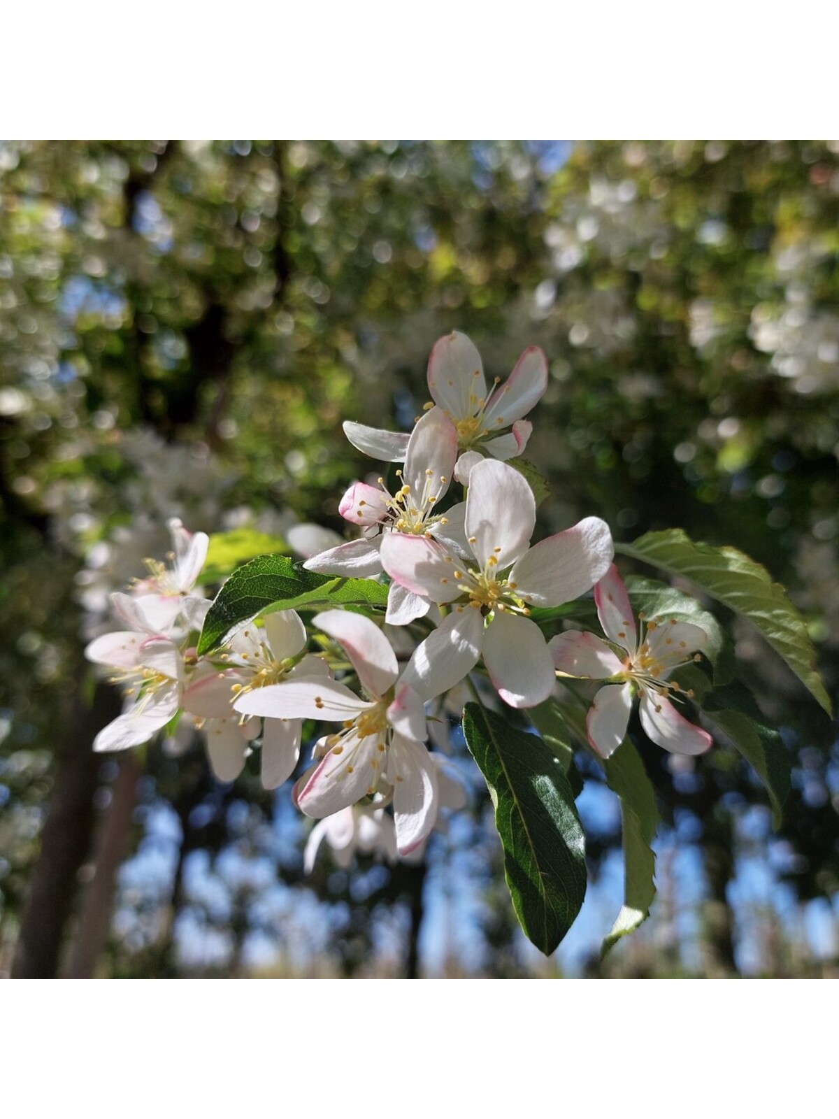 Im Sommer entwickeln sich die Äpfel, die anfangs klein und grün sind und allmählich ihre volle Größe und Farbe erreichen. Dies ist auch die Zeit, in der der Baum am meisten Wasser benötigt. Die Blütezeit ist von Mai bis Juni und die Blätter sind sommergrün, wechselständig, eiförmig bis elliptisch und kurz zugespitzt.
