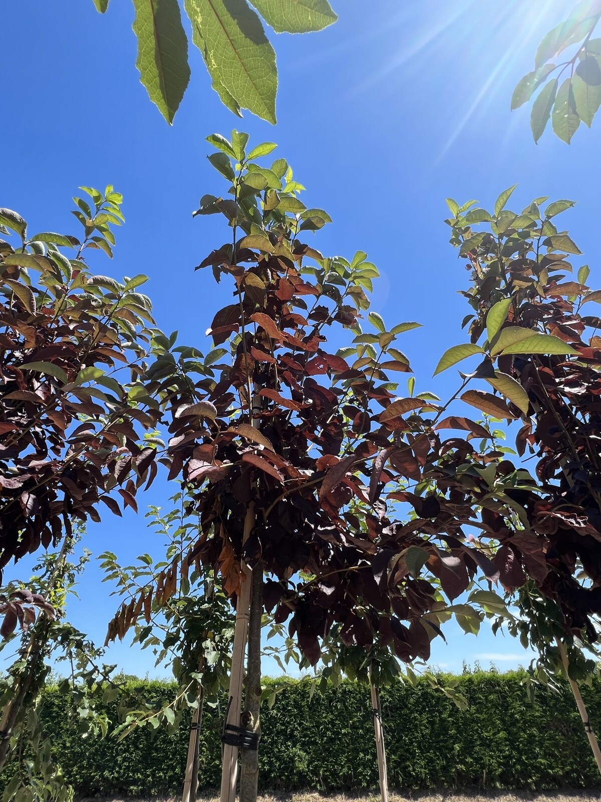 Die Prunus virginiana 'Shubert' zeichnet sich durch ihre auffällige Blattfärbung aus. Im Frühjahr erscheinen leuchtend grüne Blätter, die im Laufe des Sommers in ein tiefes Purpurrot übergehen. Dieses faszinierende Farbenspiel macht sie zu einem echten Blickfang in jeder Umgebung.