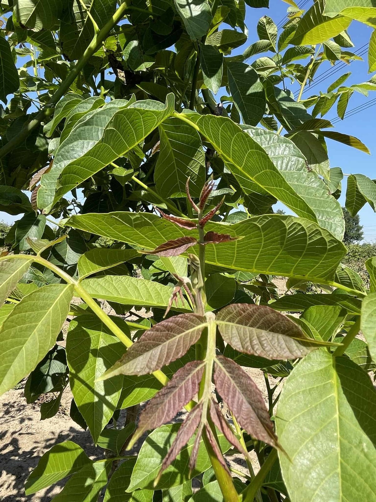 Dichtes, aromatisches Laub spendet angenehmen Schatten; grüne Nussfrüchte entwickeln sich in den Kronenbereichen.