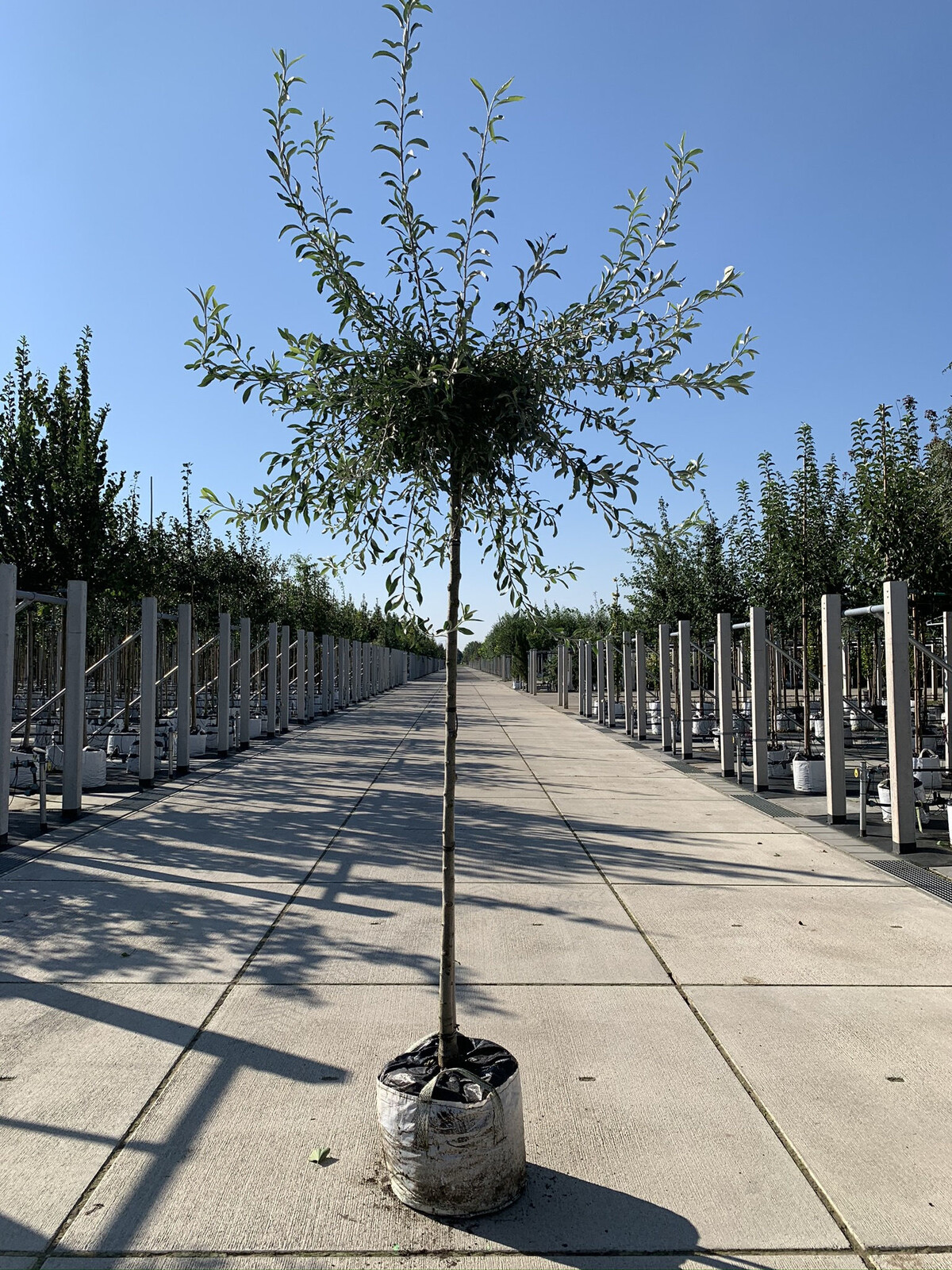 Ein oben veredelter Baum hat, wie auf den Fotos zu sehen ist, eine runde, kugelförmige Krone und die Stammhöhe wird nicht höher werden als zum Zeitpunkt des Kaufs. Ein Baum mit einer Stammhöhe von 180 cm wird also auch nach 20 Jahren immer noch eine Stammhöhe von 180 cm haben. Die andere Variante auf unserer Website ist unten veredelt und hat daher eine durchgehende Spitze und kann theoretisch eine Höhe von 7 m erreichen.