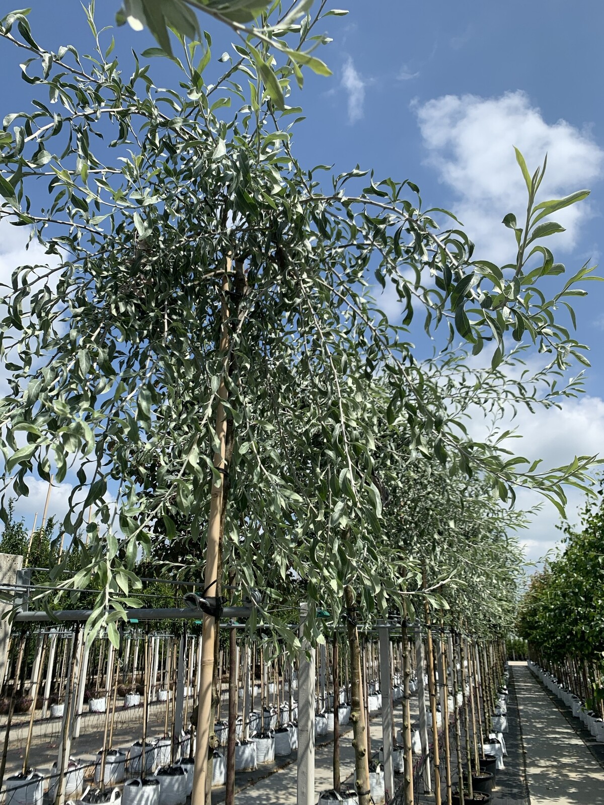 Bei einer oben veredelten Pyrus salicifolia 'Pendula' hingegen wird die Veredlungstechnik auf den oberen Teil des Baumes, auch als Krone bezeichnet, angewendet. Das bedeutet, dass Triebe der Pyrus salicifolia 'Pendula' in Höhen wie 120, 150, 180 und 225 cm am Baum 'platziert' werden und bei Austrieb die Krone tatsächlich dort beginnt.