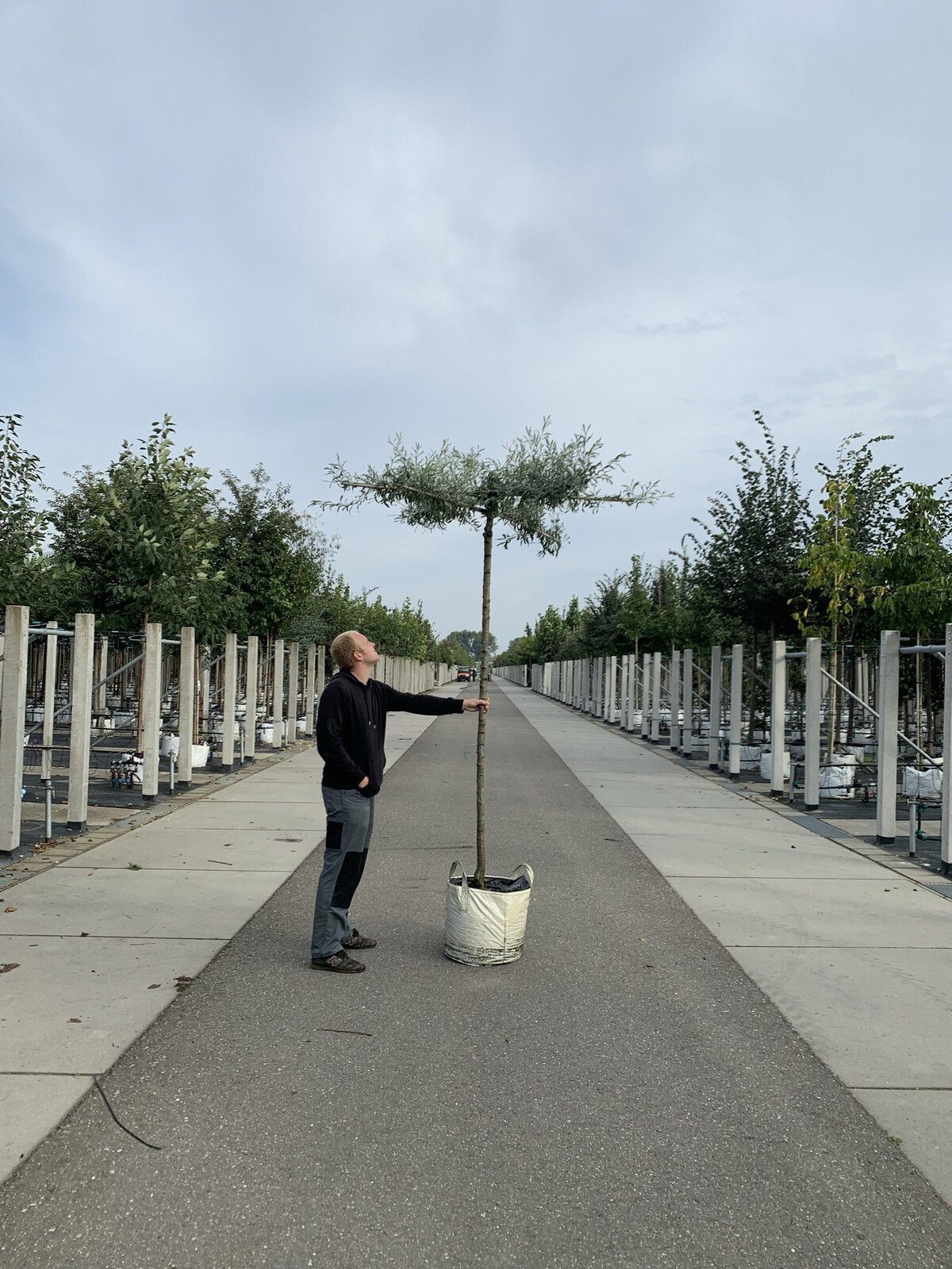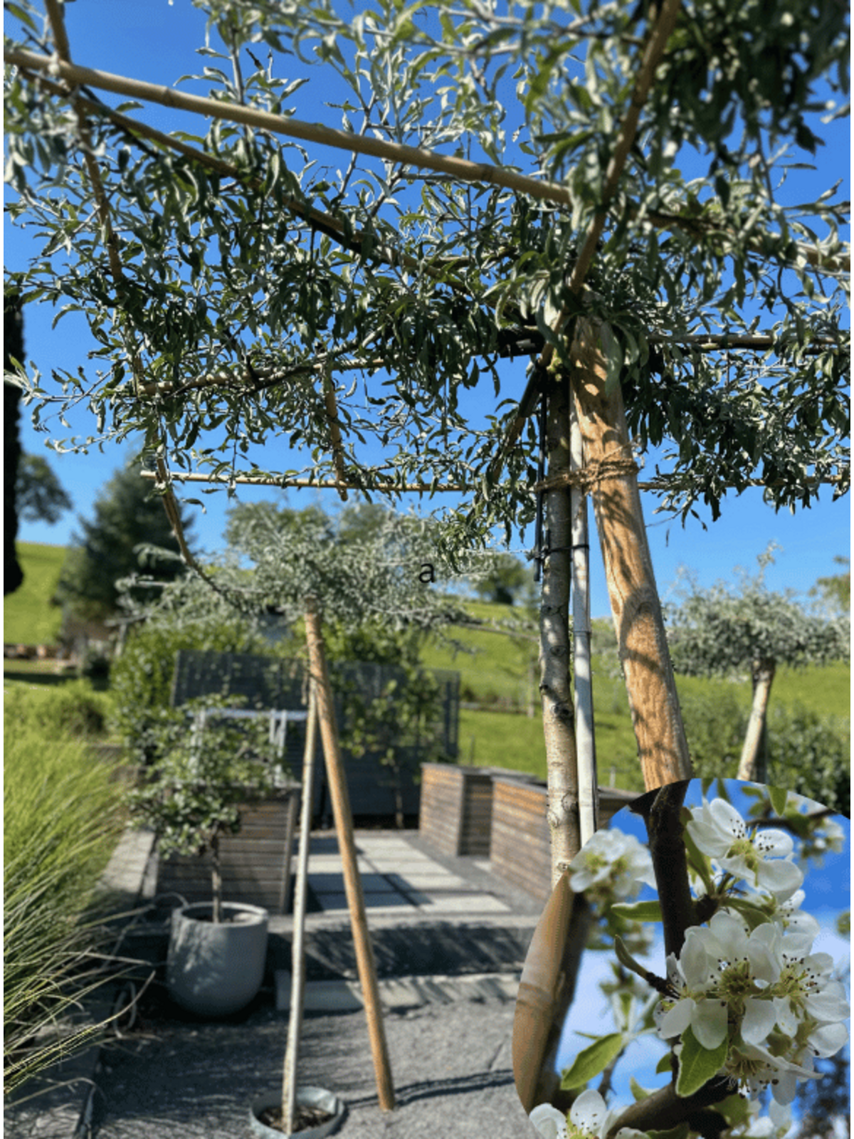 Die Pyrus salicifolia 'Pendula' hat einen kompakten, eleganten Wuchs und wird als Dachbaum so geführt, dass sie eine horizontale Struktur bildet. Der Baum erreicht eine Höhe von etwa 3 bis 5 Metern und bleibt damit leicht zu kontrollieren. Seine herabhängenden Zweige verleihen ihm eine einzigartige Optik und machen ihn zu einer dekorativen Bereicherung in jedem Garten.