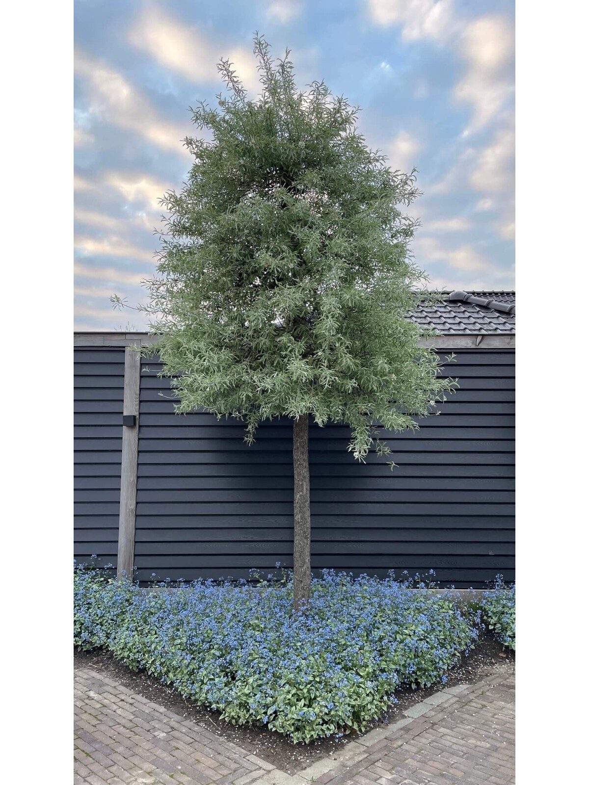 Die Weidenblättrige Birne Hochstamm, botanisch Pyrus salicifolia 'Pendula', ist eine besondere Ergänzung für jeden Garten. Dieser Hochstamm-Baum besticht durch seine elegante, überhängende Wuchsform und die silbrig-grünen Blätter, die ihm ein mediterranes Flair verleihen. Er erreicht eine Höhe von 4 bis 7 Metern und eine Breite von 3 bis 4 Metern. Diese Hochstamm Variante der Weidenblättrigen Birne eignet sich hervorragend als Solitärbaum in kleinen Gärten, Höfen und an exponierten Stellen.