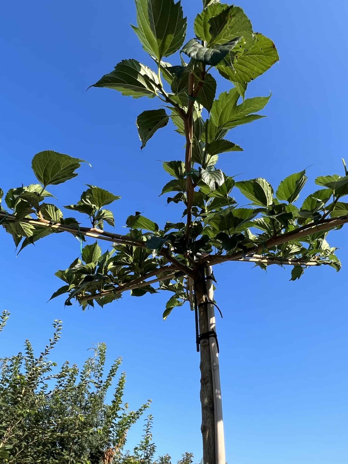 Die Bildung der Dachform des Weißer Maulbeerbaum 'Macrophylla' erfordert fachkundige Pflege und Geduld. Die jungen Bäume werden durch gezielten Schnitt in eine horizontale Ebene geleitet und regelmäßig beschnitten, um die charakteristische Dachform zu entwickeln. Dieser Prozess verlangt Fachwissen und Erfahrung, da das Wachstum des Baumes kontrolliert und unterstützt werden muss, um eine gleichmäßige und dichte Krone zu gewährleisten. Dies macht jeden Dach-Maulbeerbaum zu einem einzigartigen Kunstwerk in Ihrem Garten.