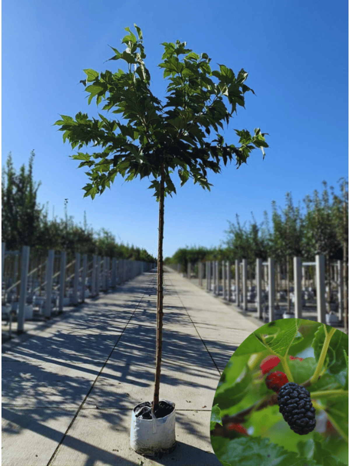 Der Weißer Maulbeerbaum 'Macrophylla' ist für seine Pflegeleichtigkeit und Robustheit bekannt. Er bevorzugt sonnige bis halbschattige Standorte und kommt mit den meisten Bodenarten gut zurecht. Regelmäßiges Gießen in den ersten Wachstumsjahren unterstützt eine gesunde Entwicklung. Sobald der Baum etabliert ist, benötigt er nur noch minimale Pflege. Beschneiden ist selten erforderlich, kann aber durchgeführt werden, um die Form zu erhalten oder zu korrigieren. Dieser geringe Pflegeaufwand macht den Morus alba Macrophylla zu einer idealen Wahl für beschäftigte Gartenbesitzer und Naturfreunde, die einen unkomplizierten, aber eindrucksvollen Baum suchen.