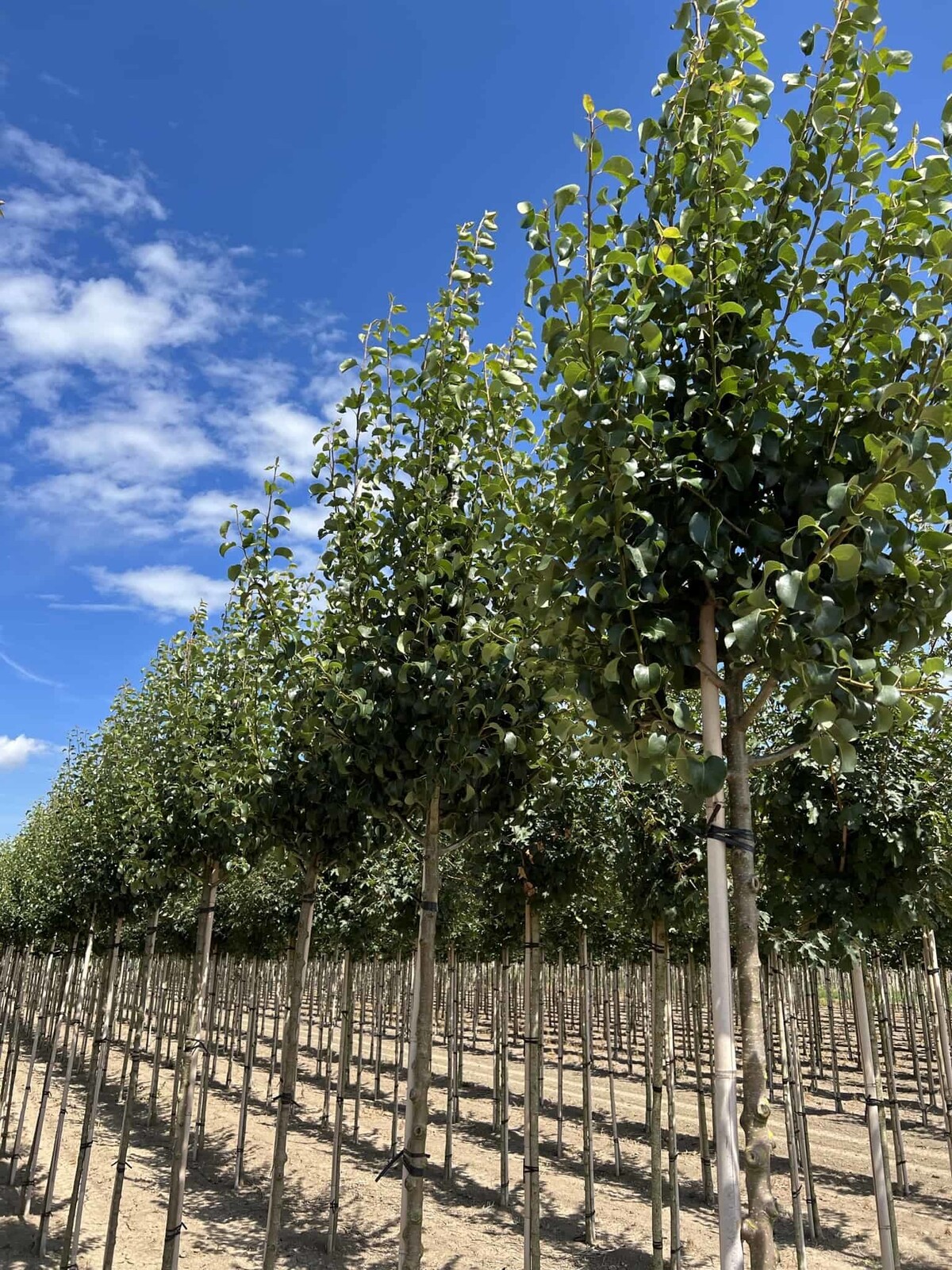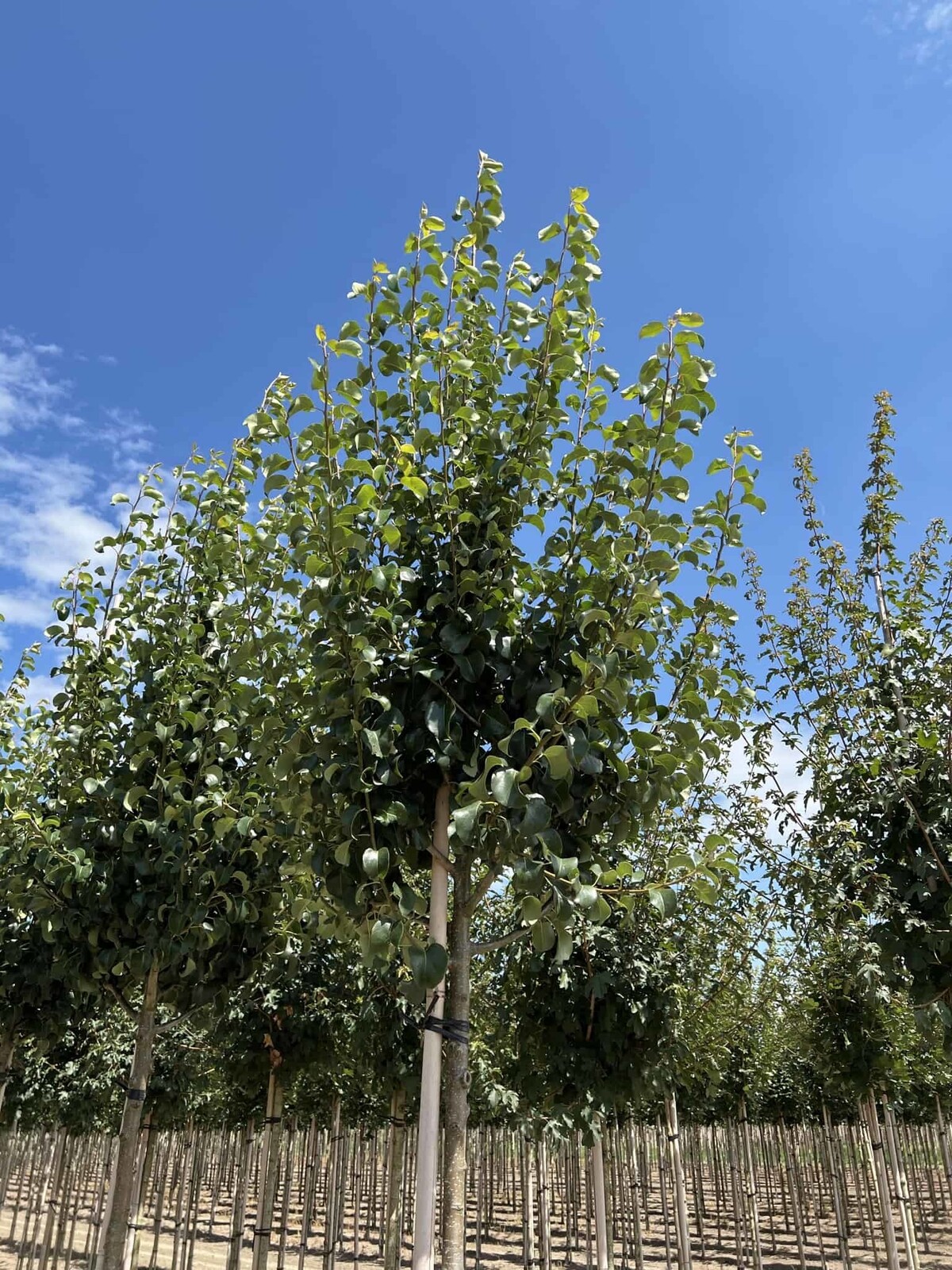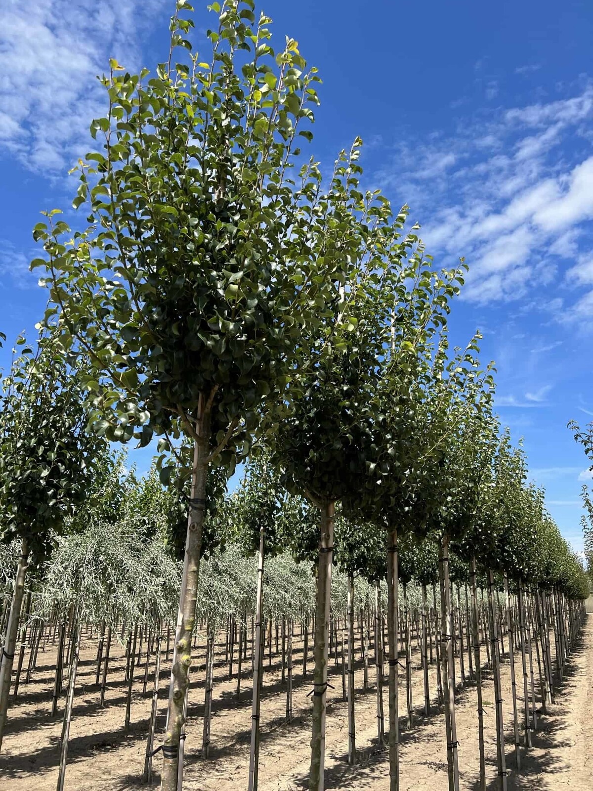 Die Pyrus communis 'Beech Hill' wächst zu einem mittelgroßen Baum heran und erreicht eine Höhe von etwa 8 bis 12 Metern. Sie hat eine schmale, aufrechte Form, die sich im Laufe der Jahre zu einer offeneren und runderen Krone entwickelt. Dank ihrer natürlichen und eleganten Erscheinung eignet sie sich hervorragend für ländliche Gärten, Parks oder als Solitärbaum in größeren Außenbereichen.