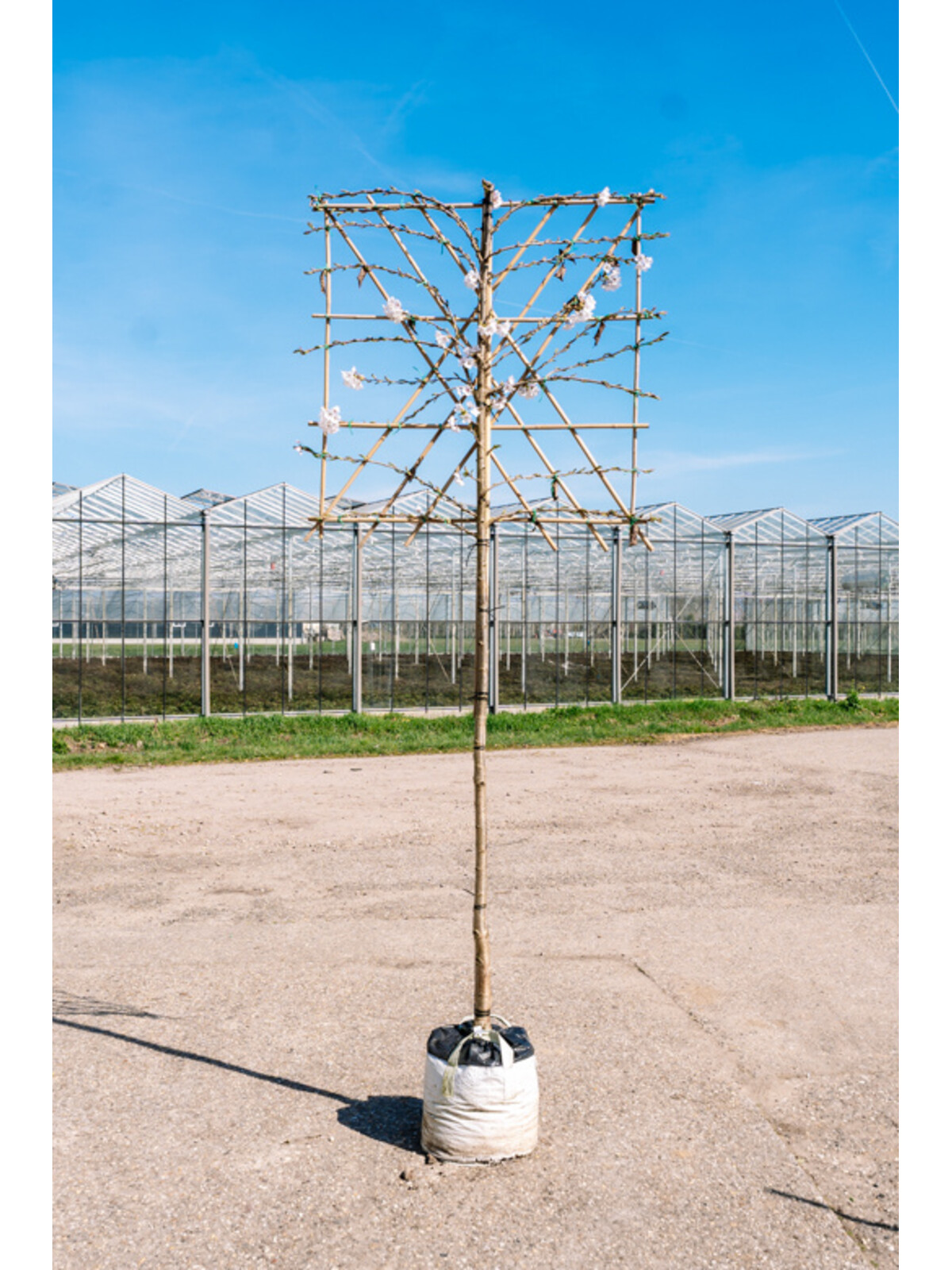 Der Prunus subh. 'Autumnalis' wächst als Spalierbaum in kompakter Form und ist ideal für kleine Räume geeignet. Der Baum kann eine Höhe von etwa 3 bis 4 Metern erreichen, was ihn perfekt für kleinere Gärten oder Terrassen macht. Dieser Baum lässt sich hervorragend als Spalier formen und kann problemlos an einer Wand oder einem Zaun entlanggeführt werden. Das macht den Baum zu einer vielseitigen Wahl für verschiedene Gartengestaltungen.