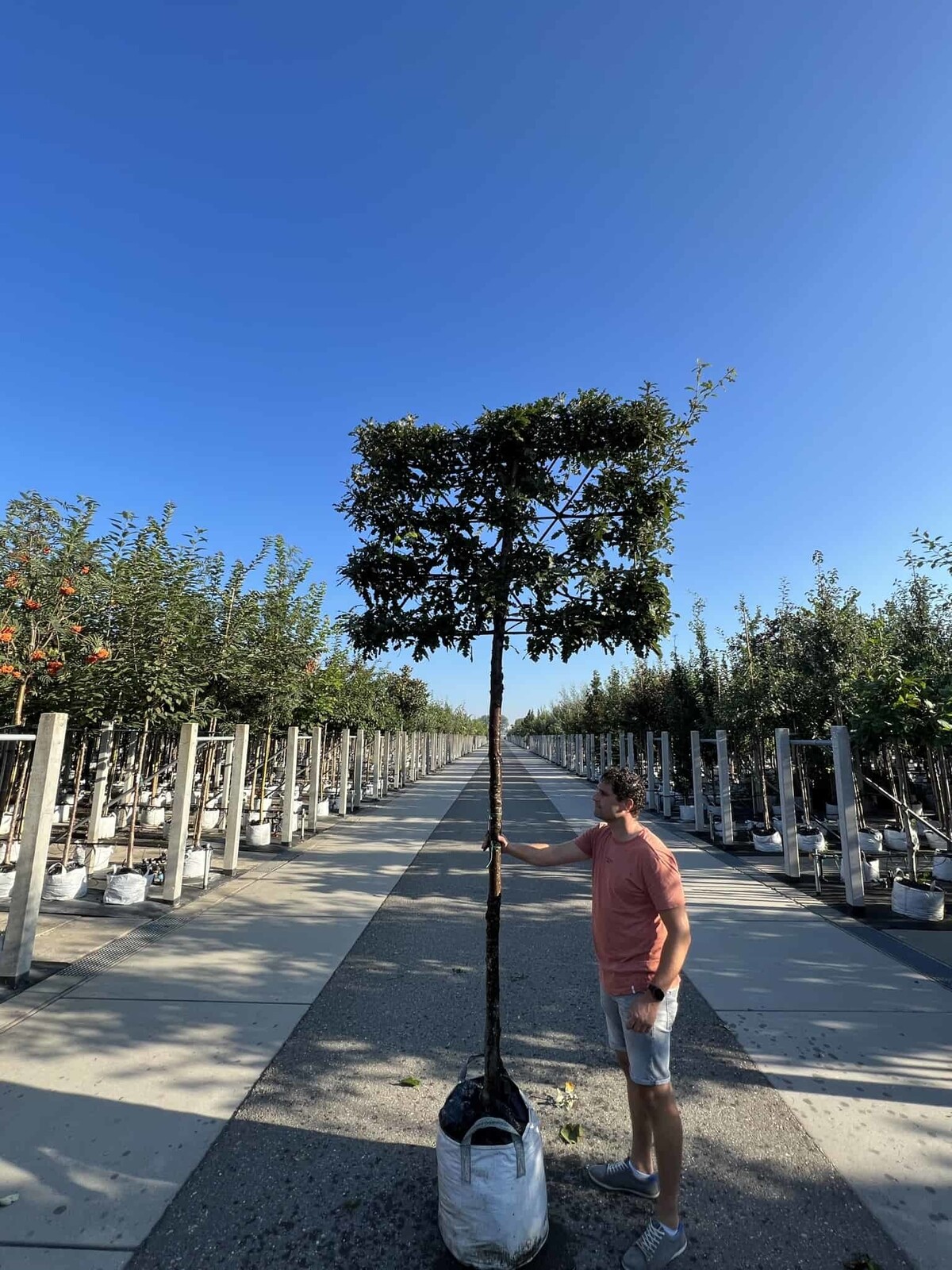 Der Zerreiche Spalierbaum zeichnet sich durch sein kräftiges Wachstum und seine markante Blattform aus. Die Blätter sind tief gelappt und im Herbst färben sie sich in spektakulären Rot- und Orangetönen. Die Spalierform wird sorgfältig durch regelmäßigen Schnitt erhalten, was den Baum ideal für formale Gärten macht.