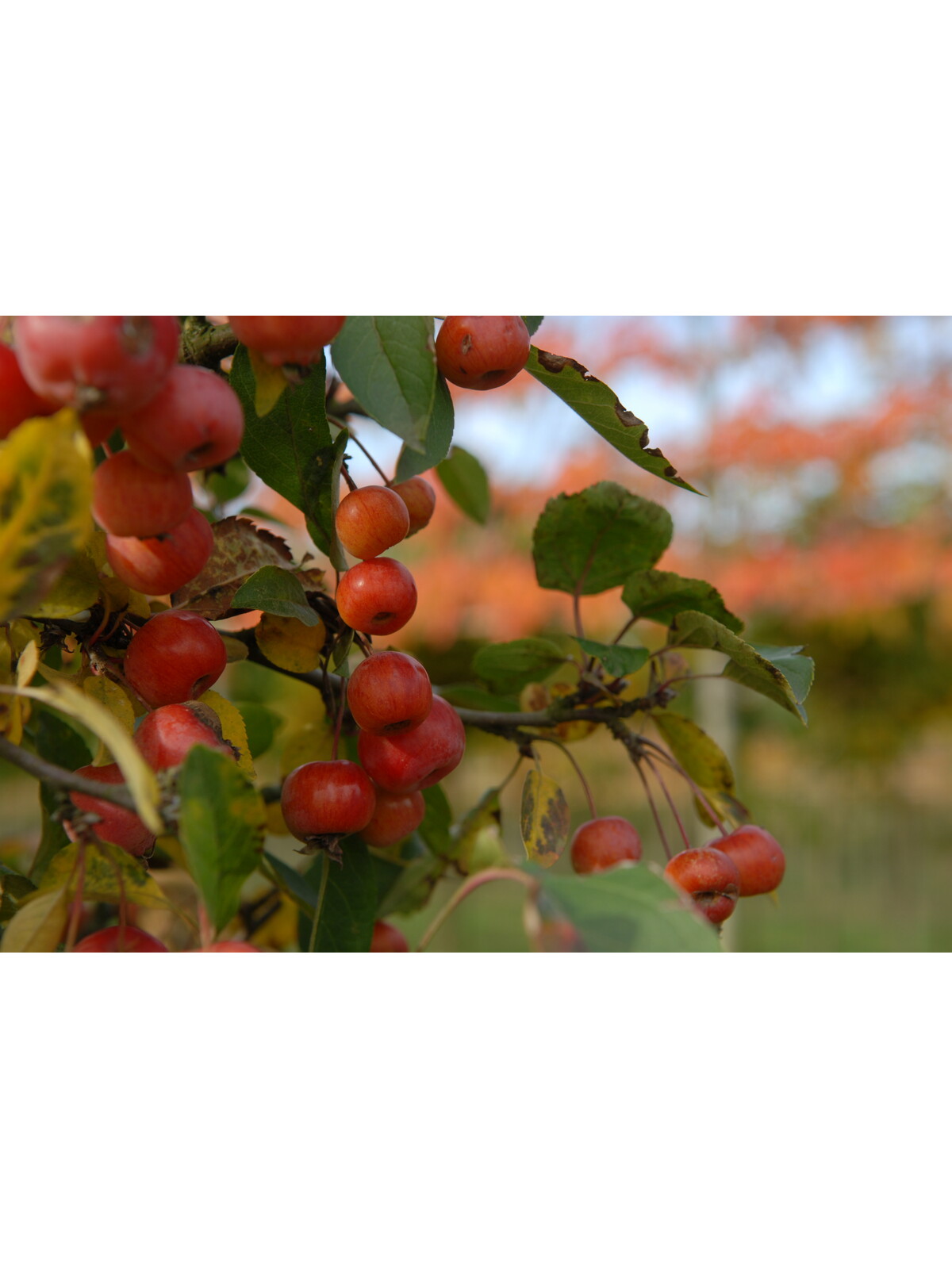 Im Herbst fasziniert der Zierapfel 'Evereste' mit seinen farbenfrohen Früchten und dem sich verfärbenden Laub, das von grün zu goldgelb und rot wechselt.