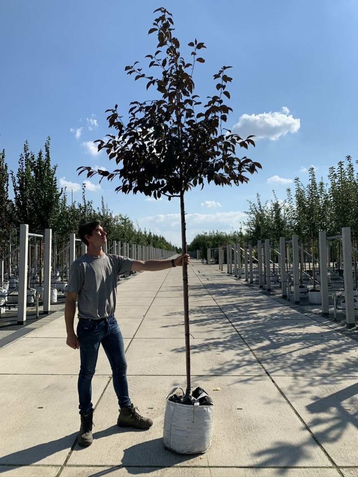 Malus 'Royalty' ist ein kleiner bis mittelgroßer Baum, der eine Höhe von 3 bis 6 Metern erreichen kann. Dank seines kompakten, aufrechten Wuchses eignet er sich perfekt für Gärten unterschiedlicher Größe. Die tiefvioletten bis roten Blätter behalten während der gesamten Wachstumsperiode ihre kräftige Farbe und verleihen dem Baum eine edle Optik.