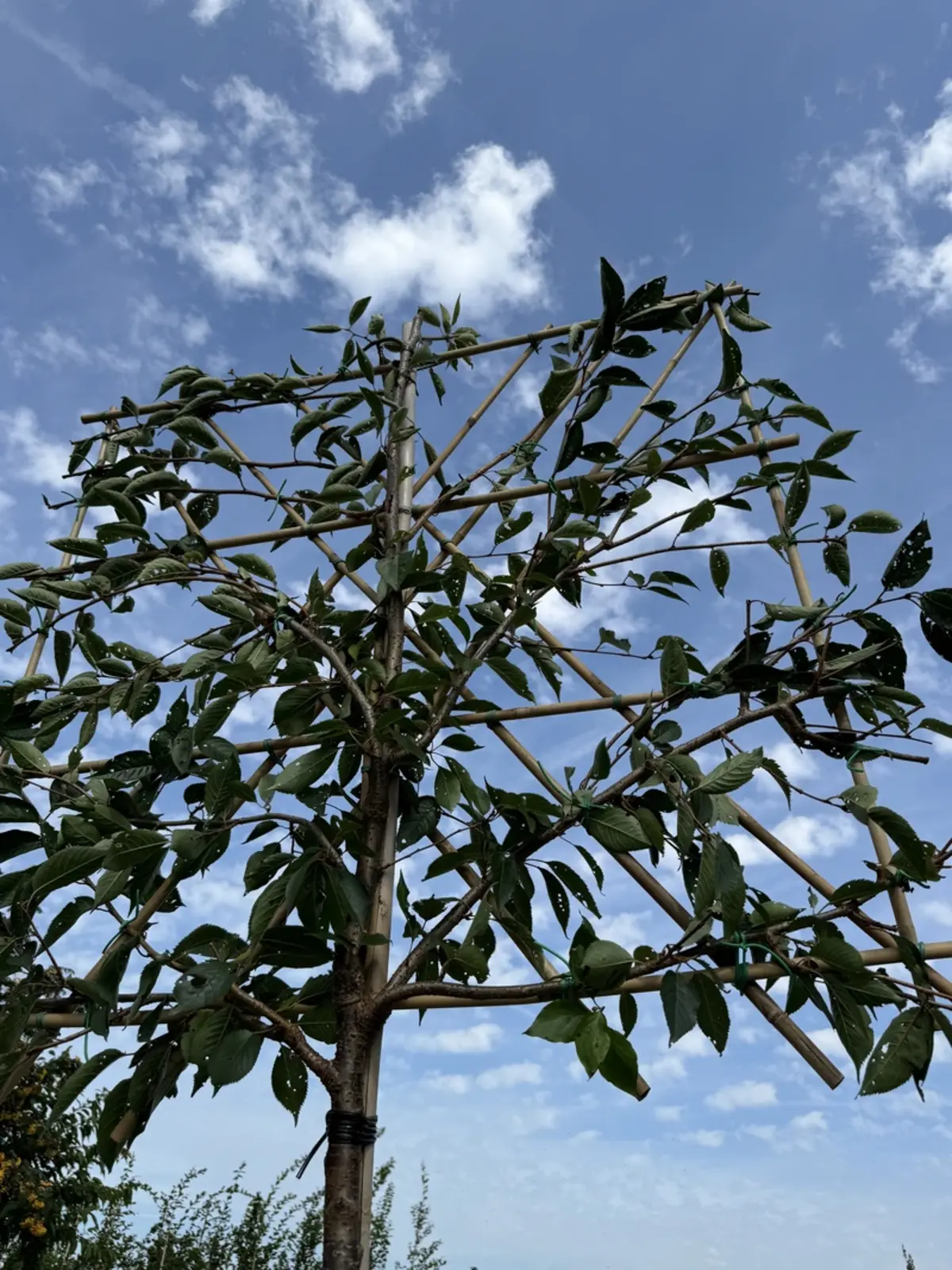 Die Zierkirsche 'Accolade' beeindruckt im Frühjahr mit ihren zarten, hellrosa Blüten, die in Büscheln an den Ästen erscheinen. Von März bis April verwandelt sich der Baum in ein wahres Blütenmeer, das Bienen und Schmetterlinge anzieht. Die Spalierform verstärkt diese Pracht, da die Blüten entlang der Zweige gleichmäßig zur Geltung kommen. Diese Frühjahrsblüte macht den Baum zu einem Highlight in jedem Garten.