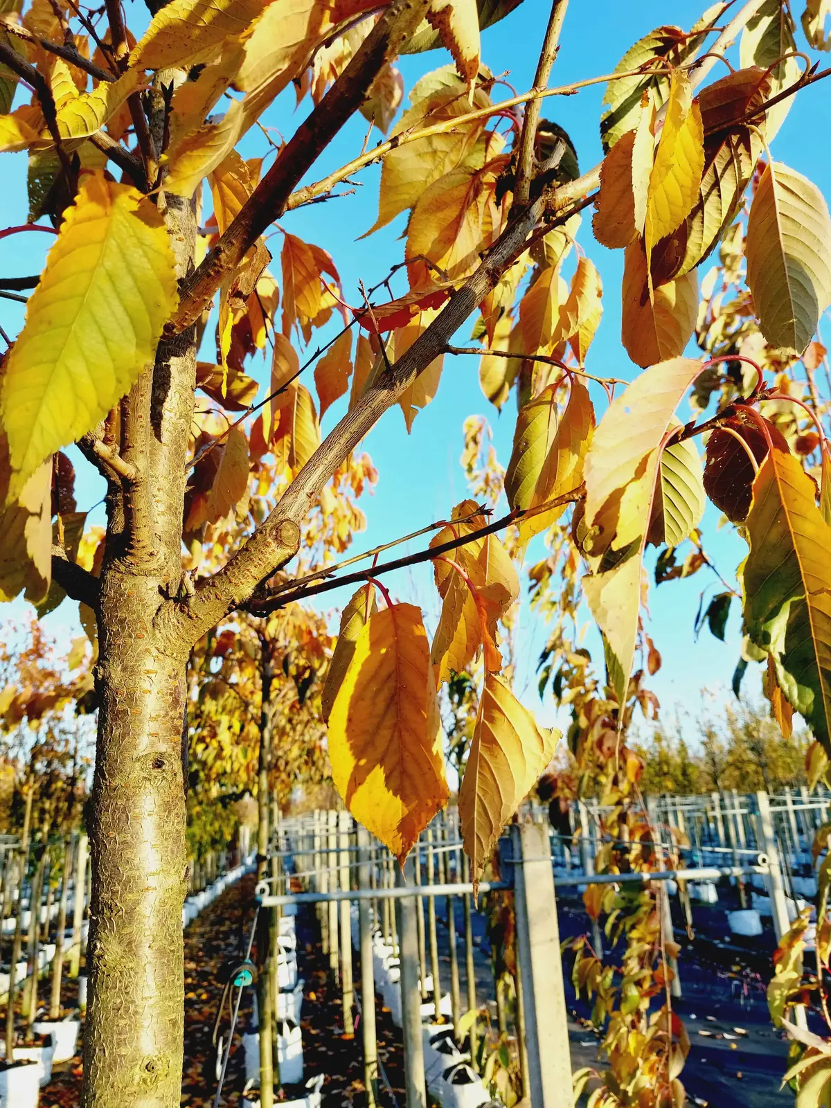 Die Zierkirsche Shirofugen bietet das ganze Jahr über visuelles Interesse. Neben der spektakulären Frühlingsblüte verfärbt sich das Laub im Herbst in wunderschöne Gelb- und Orangetöne, bevor es abfällt und den eleganten Wuchs des Baumes im Winter hervorhebt.